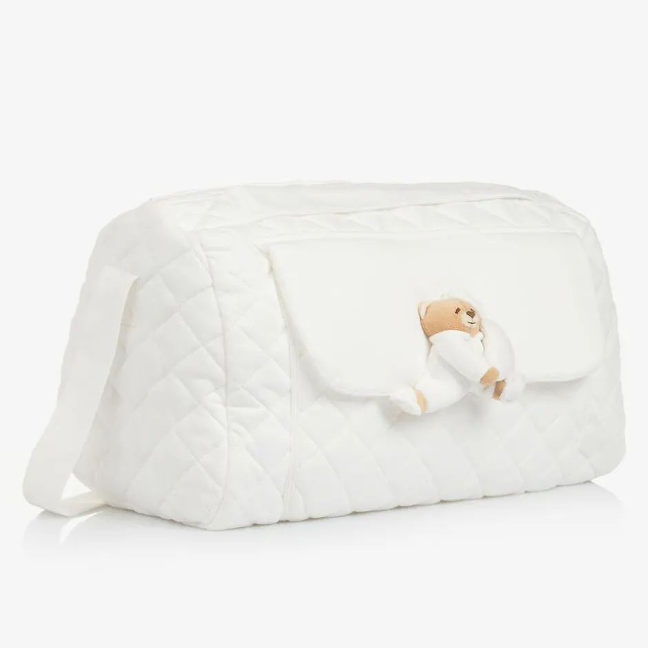 Ivory changing bag by Nanán, made in soft quilted cotton jersey with a cute teddy appliqué on the front. Lightly padded, it has one main zipped compartment with internal pouches to help store essential items safely. There is an additional velcro fastening pocket on the front, two easy carry handles and a long shoulder strap. It also comes with a lightweight jersey changing mat.