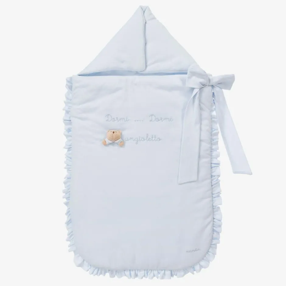 A light blue baby nest for boys and girls by Nanán, made in soft cotton jersey with lightweight padding. Warm and cosy, it has an easy zip fastening down one side and across the bottom. There are popper fastenings on the hood, which can be opened and laid flat like a pillow. It has a decorative ruffled trim around the edge, as well as a fixed bow and a sweet teddy bear appliqué on the front. The tonal embroidery reads 'Sleep… sleep little angel' in Italian, along with the brand's name seen in one corner.