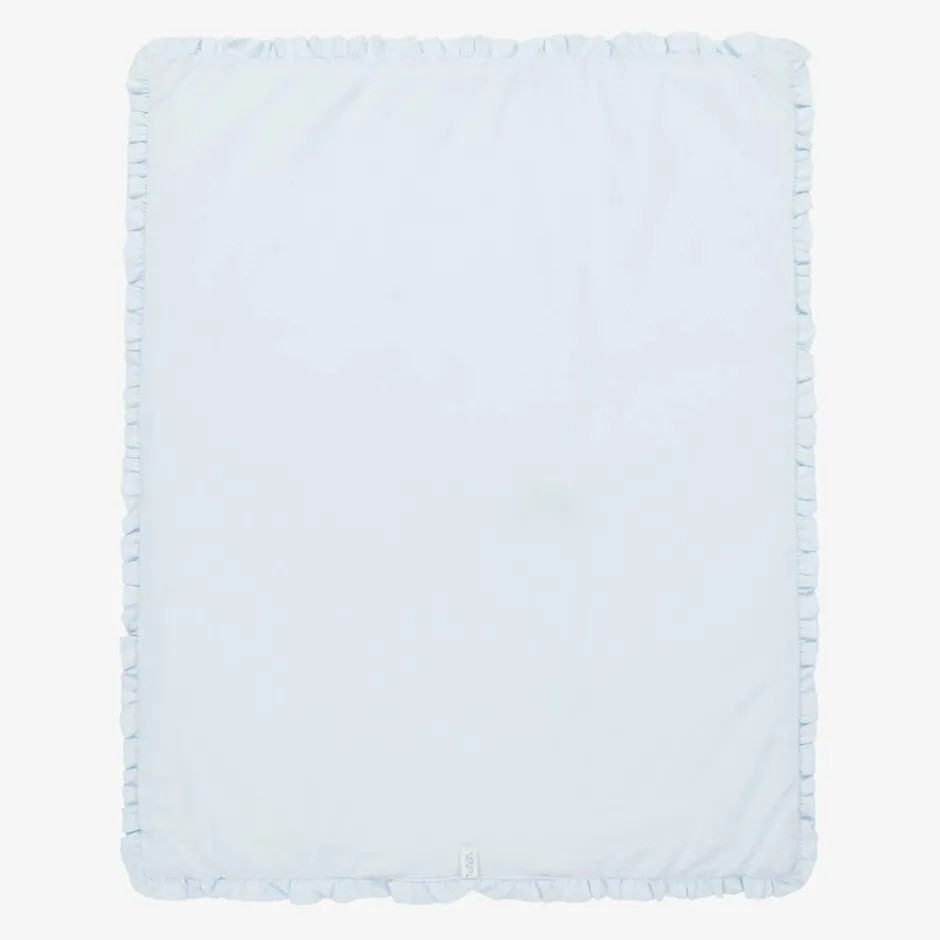 A lovely light blue blanket for baby boys and girls by Nanán, made in soft cotton jersey with light padding. Ideal for the cot or pram, this cute accessory has a decorative ruffled trim around the edge and a sweet teddy bear appliqué on the front. The tonal embroidery reads 'Sleep… sleep little angel' in Italian, along with the brand's name seen in one corner. It comes with a buttoned fabric bag for easy storage.