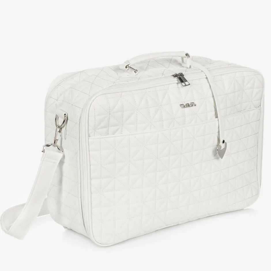 Luxury white suitcase by Nanán, made from faux leather with a diamond quilting pattern and a silky lining. A lovely gift for parents-to-be, it is ideal for use as a hospital or overnight bag and comes with a babygrow, bodyvest, hat, mittens, muslin and towel, all in beautifully soft organic cotton. The bag has two zipped compartments with useful internal pockets, and a further velcro pocket on the front. There is a useful carry handle and a detachable, adjustable shoulder strap.