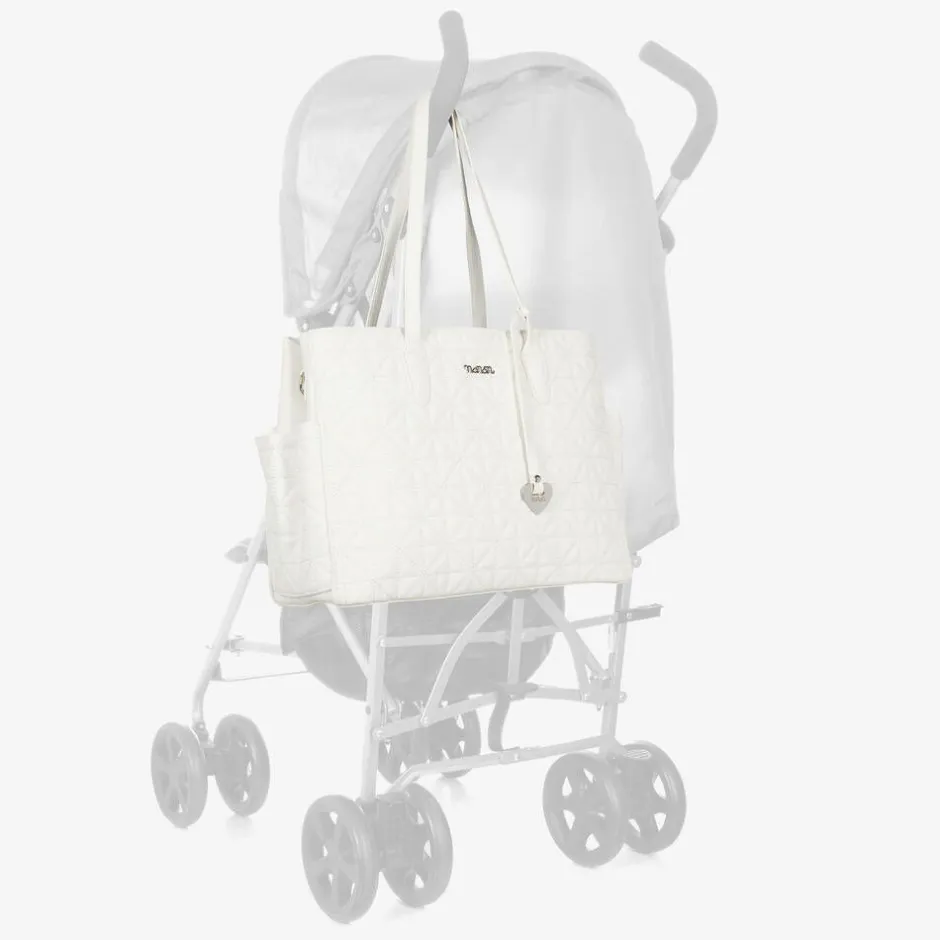 White changing bag by Nanan, made in soft quilted faux leather. The spacious main compartment has internal pockets and is divided by a zip fastening pouch, helping with organisation. It comes with a useful, wipe clean mat for changing your little one on-the-go, and an adjustable shoulder strap to add an extra carry option.