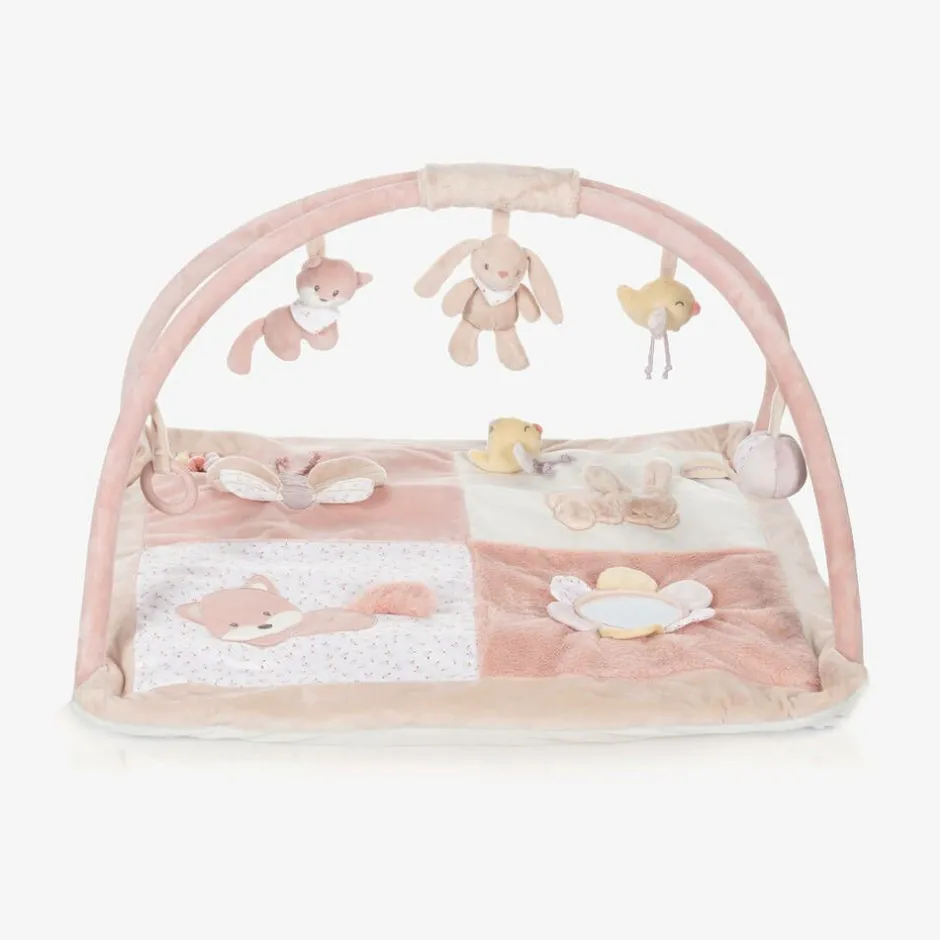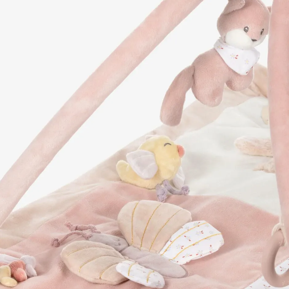 Lovely pink playmat for baby girls by Nattou, made in luxuriously soft plush. Padded for comfort, this fun play accessory includes over twenty five activities for your little one. From crackling paper and rattles to squeakers and silicone rings, it supports children's curious nature, engages all of their senses, and promotes development of their dexterity and fine motor skills. The arches have adorable rattle and squeaker hanging toys, and attach simply onto the mat with easy-to-use buckle clips.