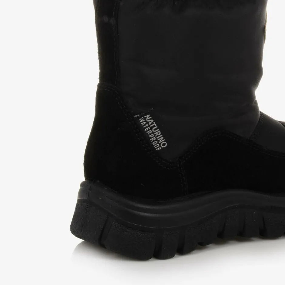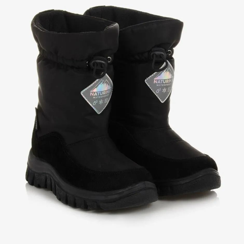 Black waterproof snow boots for boys by Naturino, with a matching suede trim. The deep treads in the rubber outsoles provide good grip, and there is a silver holographic logo patch on the front for a cool, designer finish. Ideal for wet weather, these boots have a warm fleecy lining and a drawstring toggle fastening around the ankle to keep the cold out.