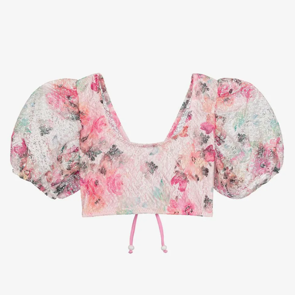 A pretty pink cropped top for older girls by American brand Nessi Byrd, great for beachwear and stylish holiday looks. With an ultraviolet protection factor of 50, the shimmery pink, stretchy fabric on the front is overlaid with light white lace. It is beautifully patterned with watercolour-style flowers in hues of pink, green and yellow. Tied easily on the back, the top has a scoop neckline and sheer puff sleeves with elasticated cuffs.