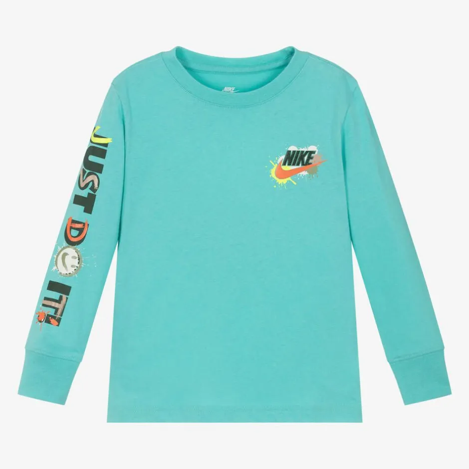 A turquoise green long-sleeved T-shirt for boys by Nike, made in a soft and comfortable cotton blend jersey. This cool top has the American brand's 'Just Do It' slogan in a colourful graphic on one sleeve and the Swoosh logo with fun paint splatters on the chest.