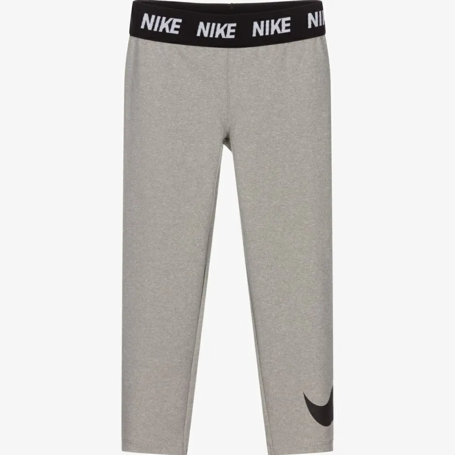 Girls grey leggings by sports brand, Nike. Soft and stretchy, they have Dri-Fit technology to move sweat away from the skin for quicker evaporation. They are full-length and have a logo-branded, elasticated waistband and Swoosh logo in black on one leg.
