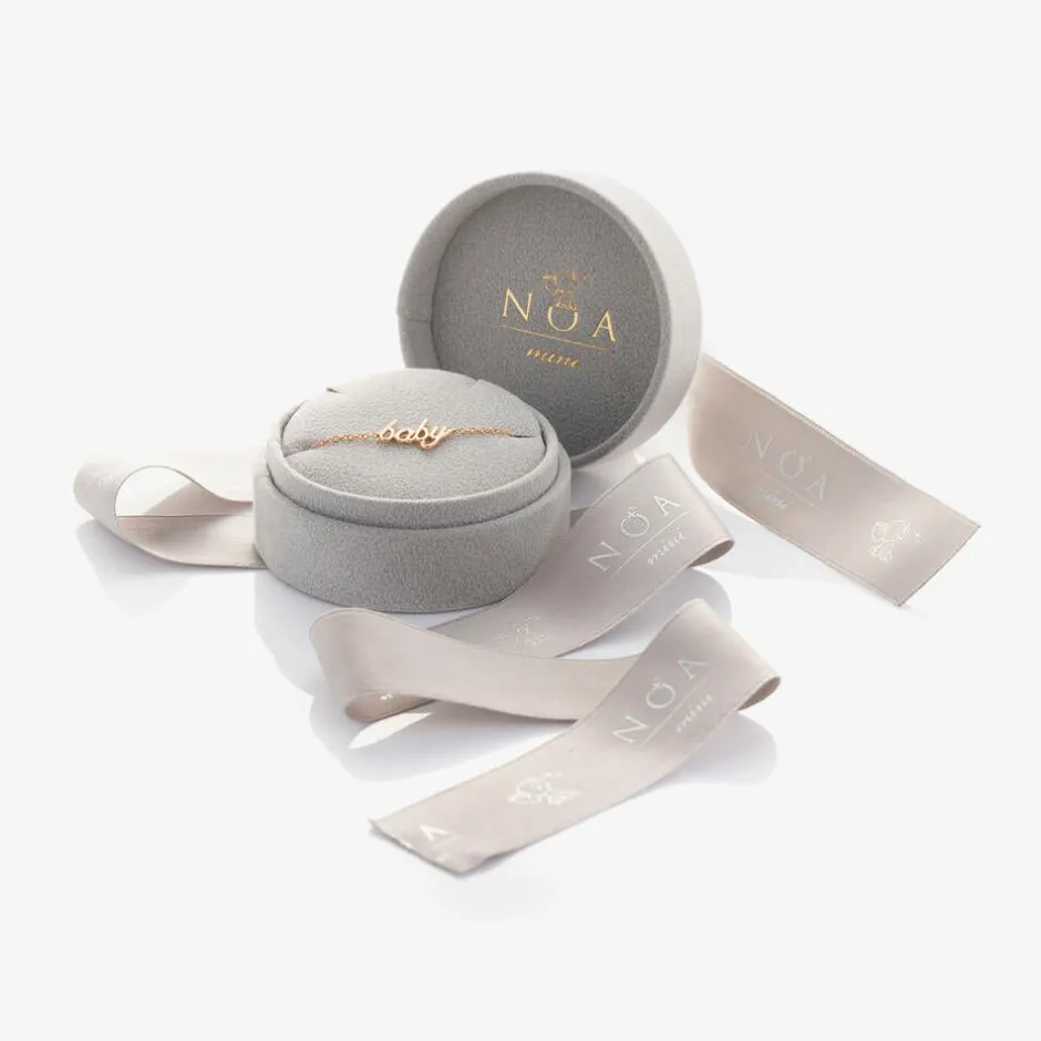 A luxurious rose gold bracelet for girls by NOA Mini, carefully handcrafted in Italy. A special gift to welcome newborns into the world, it is set on a delicate 18 karat rose gold chain with a charming 'Baby' signature. This timeless keepsake can be passed down through generations and kept as a cherished heirloom. It is exquisitely presented inside a velvet bow-tied jewellery box, with an adorable Steiff elephant for your little one to cuddle for life.