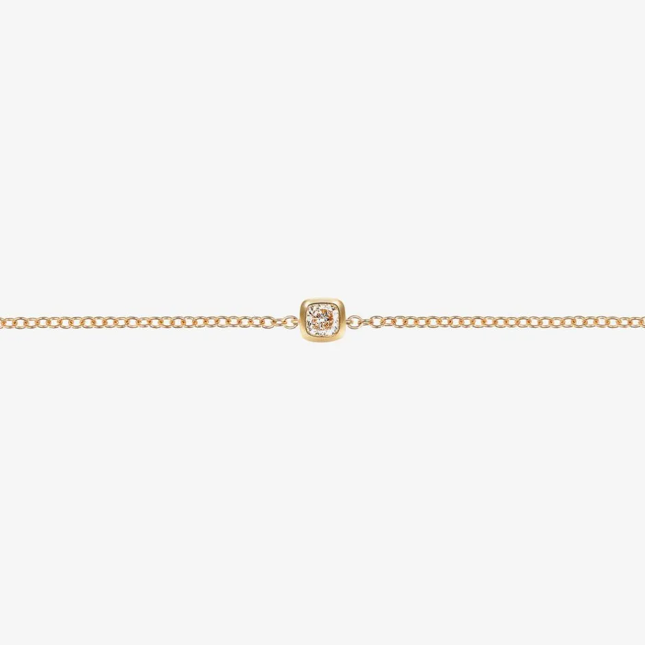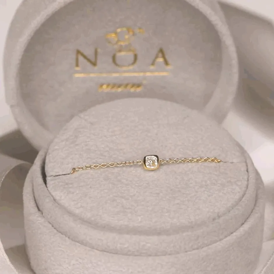A beautiful gold bracelet for little girls by NOA Mini, hand crafted in Italy. This timeless keepsake is designed to be passed through generations. The bracelet features a stunning 0.33 ct white cushion cut diamond set on a delicate 18 karat gold chain. Fastening with a delicate clasp, this stunning piece can be worn as a bracelet or anklet. Ideal as a gift for a special new arrival, it comes presented in a bow-tied velvet gift box with a lovely Steiff elephant. The cuddly Steiff elephant toy can be your baby's first friend, reminding them of their special bracelet for years to come.