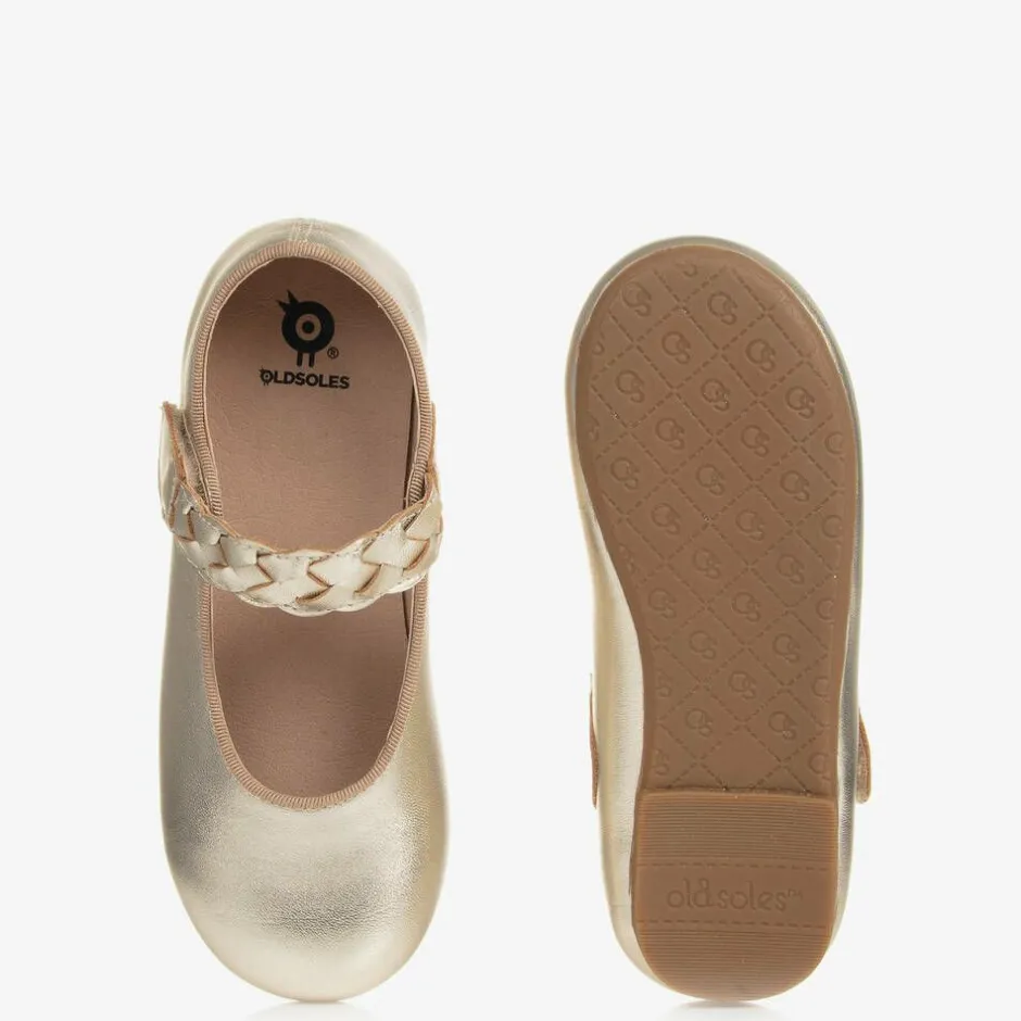 Beautiful gold pumps for girls by Old Soles, made in soft leather. The pretty braided strap fastens easily with velcro across the foot. The comfortable, cushioned insole provides support, and the non-slip rubber soles improve grip.