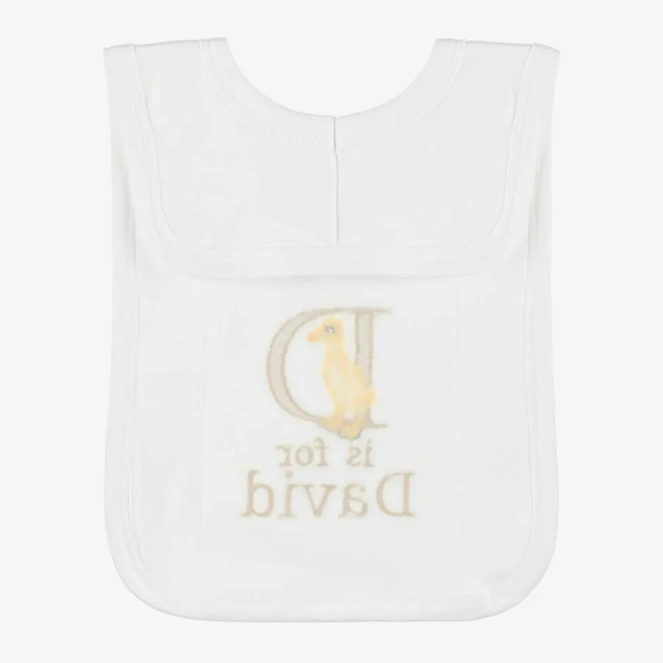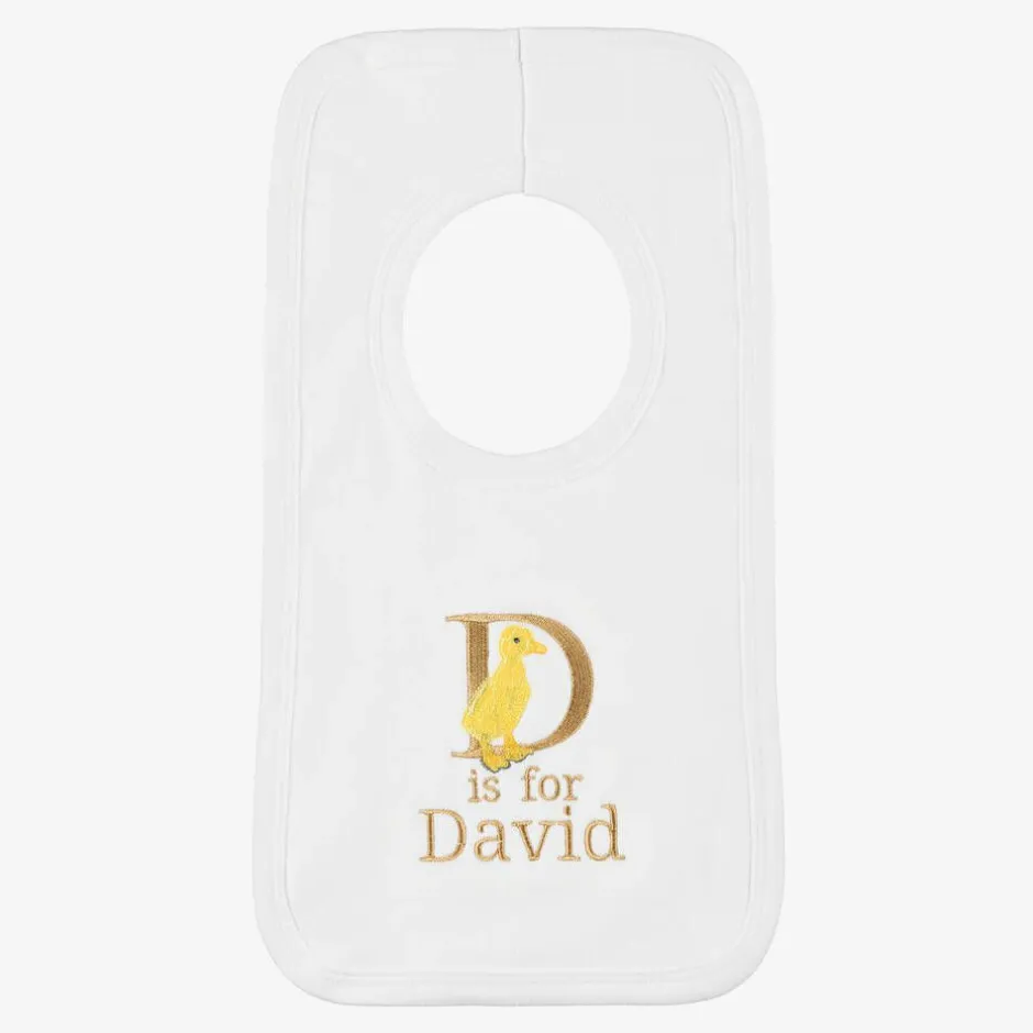 Cute white bib for baby boys and girls by Paint My Dreams, the British label. Made in soft cotton jersey for gentle comfort against delicate skin, this useful feeding accessory is ideal for catching small spills and dribble, and simply slips on over the head. Your little one's name can be embroidered below the 'D' initial and sweet duckling motif, making a thoughtful gift.