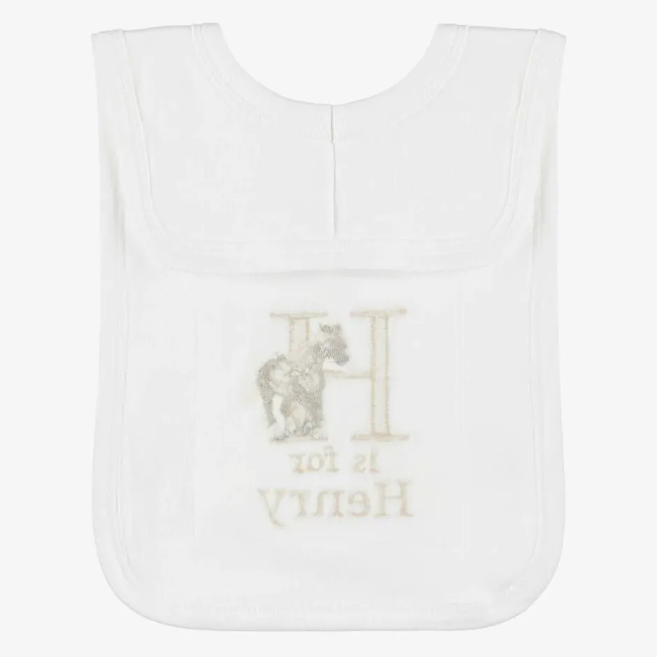 Cute white bib for baby boys and girls by Paint My Dreams, the British label. Made in soft cotton jersey for gentle comfort against delicate skin, this useful feeding accessory is ideal for catching small spills and dribble, and simply slips on over the head. Your little one's name can be embroidered below the 'H' initial and sweet horse motif, making a thoughtful gift.