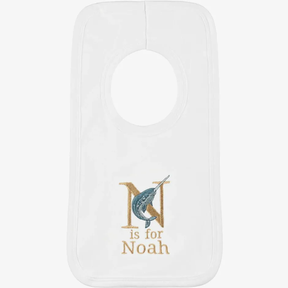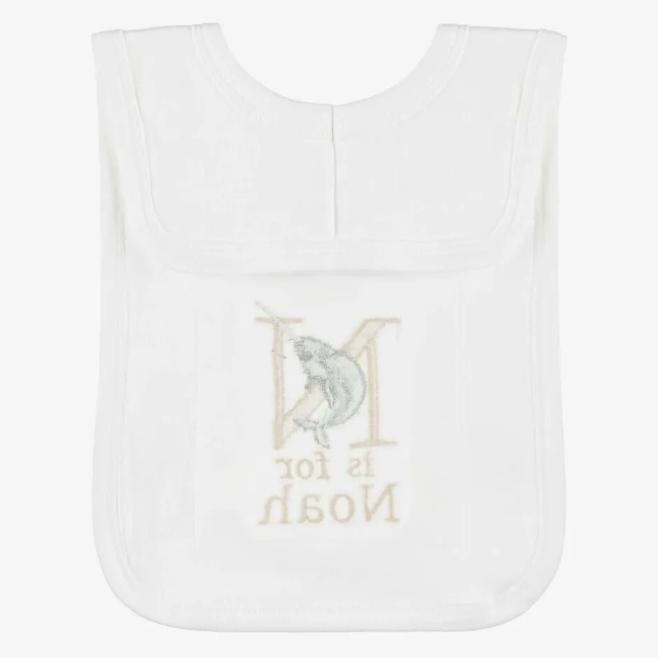 Cute white bib for baby boys and girls by Paint My Dreams, the British label. Made in soft cotton jersey for gentle comfort against delicate skin, this useful feeding accessory is ideal for catching small spills and dribble, and simply slips on over the head. Your little one's name can be embroidered below the 'N' initial and sweet narwhal motif, making a thoughtful gift.