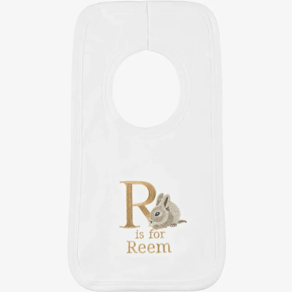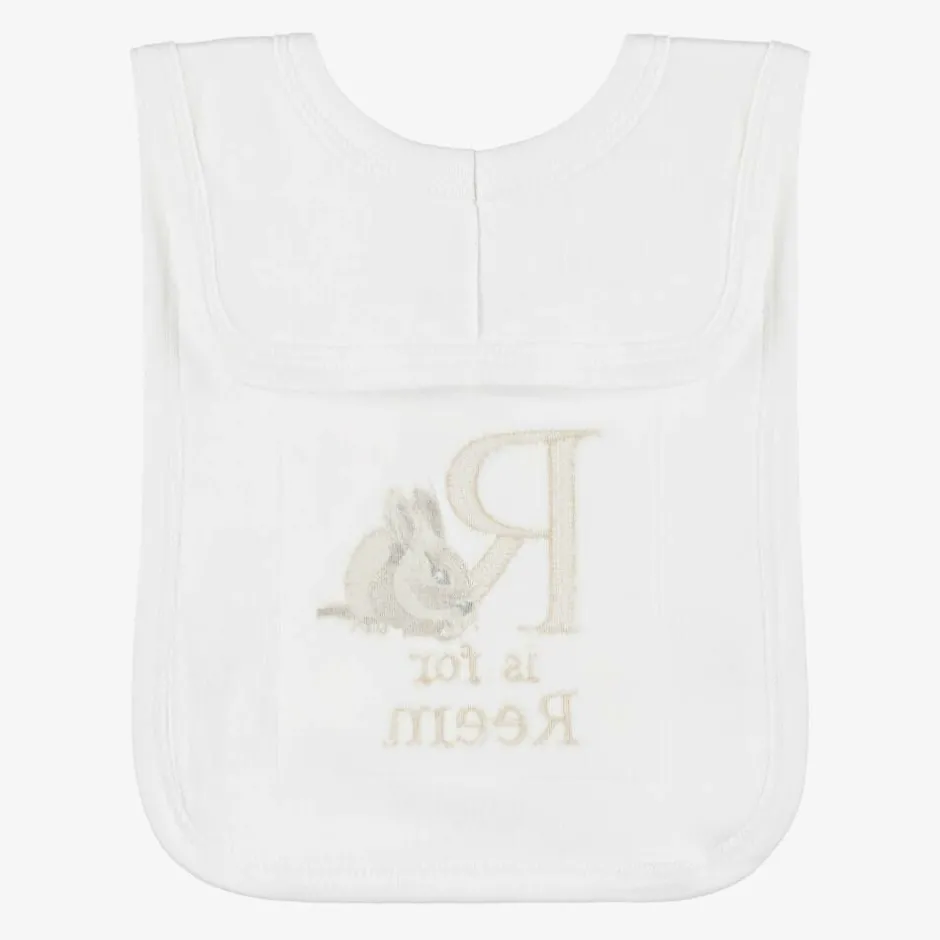 Cute white bib for baby boys and girls by Paint My Dreams, the British label. Made in soft cotton jersey for gentle comfort against delicate skin, this useful feeding accessory is ideal for catching small spills and dribble, and simply slips on over the head. Your little one's name can be embroidered below the 'R' initial and sweet bunny rabbit motif, making a thoughtful gift.