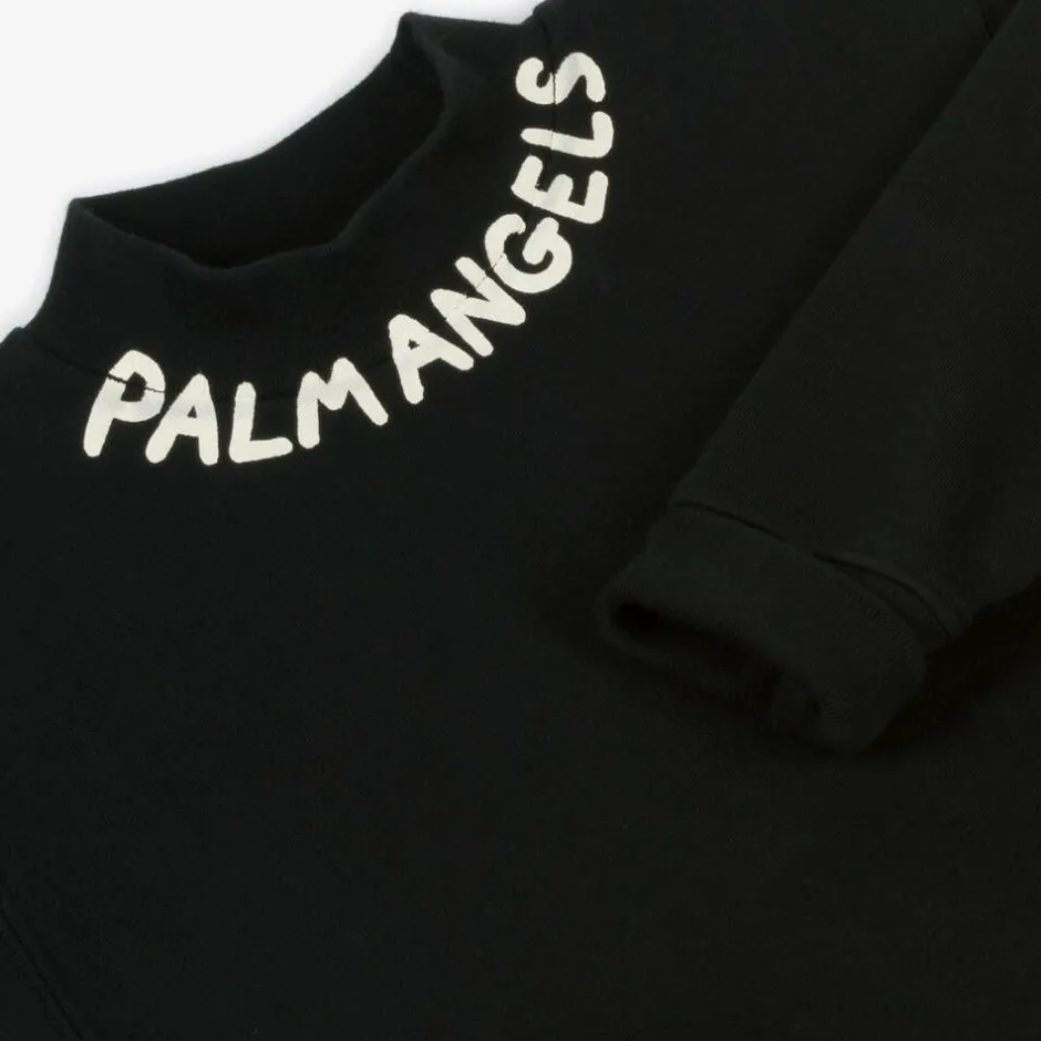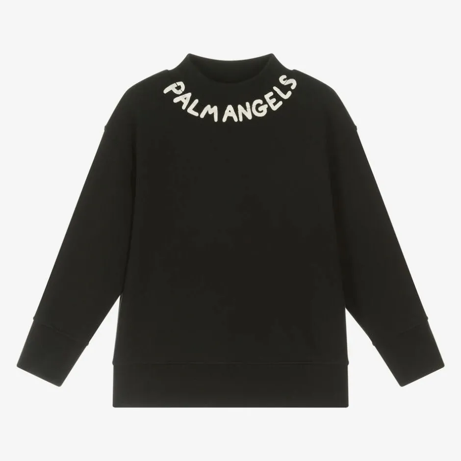 Black cotton sweatshirt for boys by Italian brand Palm Angels. It has an ivory screen-printed logo around the turtleneck, with a hand-painted effect. Made in comfortable, mid-weight jersey with a warm, fleecy inside, it has deep, ribbed trims for extra cosiness.