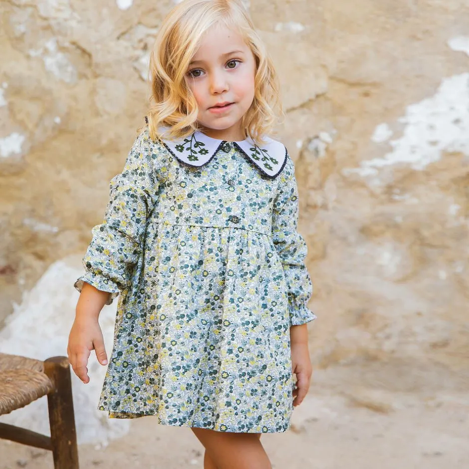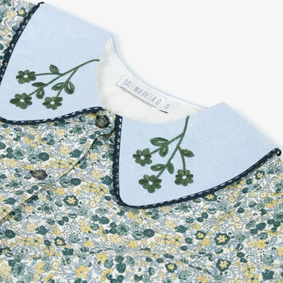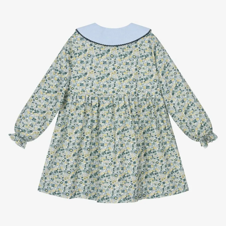 A blue dress for girls by Spanish brand Paloma de la O. It is made in soft cotton twill and patterned in a pretty floral print in shades of blue and pastel chartreuse green. It has a contrasting blue, Oxford cotton collar, trimmed in delicate lace and decorated with beautiful floral embroidery. Lined in lightweight voile for comfort, this traditional style has frilly cuffs on the long sleeves and fastens with tonal buttons on the front.