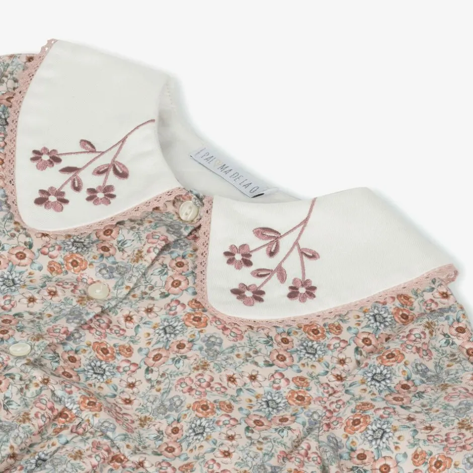Exclusive to Childrensalon, a dusky pink dress for girls by Spanish brand Paloma de la O. It is made in soft cotton twill and patterned in a pretty floral print in pink and blue. It has a contrasting white collar, trimmed in delicate lace and decorated with beautiful floral embroidery. Lined in lightweight voile for comfort, this traditional style has frilly cuffs on the long sleeves and fastens with pearlescent buttons on the front.