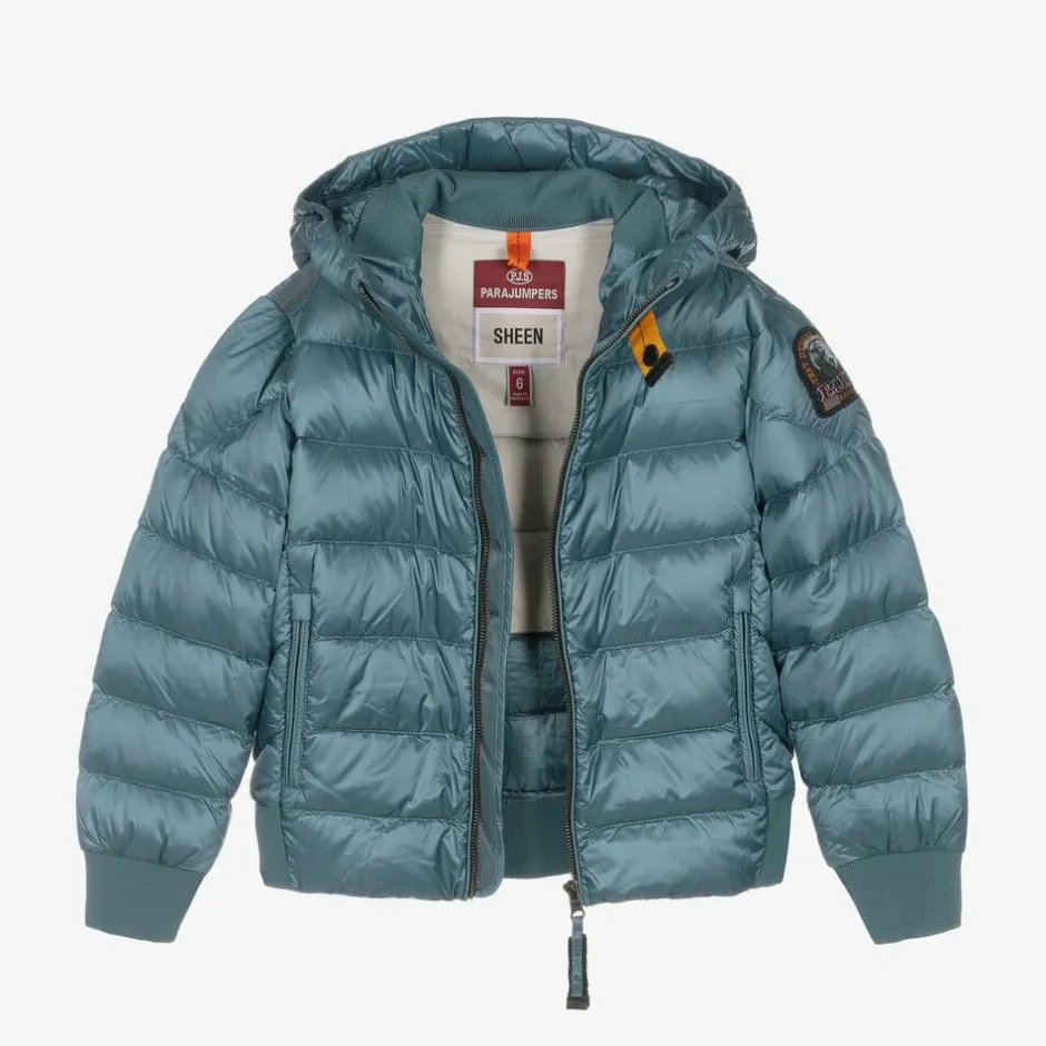 Cool light blue Mini-me hooded puffer jacket for boys by Parajumpers. Made in silky smooth fabric with a soft sheen, this down-padded jacket provide lightweight warmth for cool climates with windproof, water-repellent, breathable and down-proof qualities. It simply zips up and features bomber-style ribbed cuffs and hem, holes under the arm for ventilation, zipped external pockets and an internal mesh pocket with velcro for storing small essentials. The signature yellow velcro tape closure can be seen below the chin and the iconic logo patch is on one sleeve. This garment is made with 20% recycled fabric.