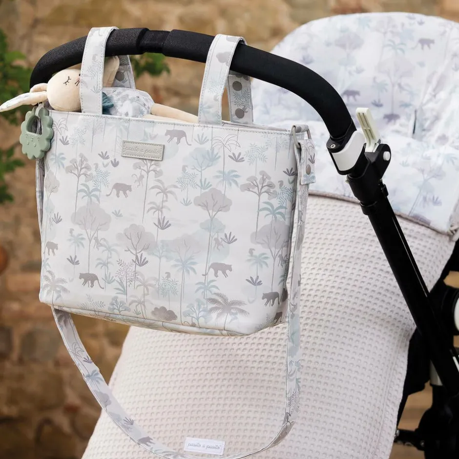 Lovely beige jungle print changing bag by Pasito a Pasito, made in easy cleaning, waterproof faux leather. The spacious, zip fastening compartment helps organise baby's essentials on-the-go, with useful internal pockets and a section to storage the baby bottle. The bag can be attached to a stroller using the adjustable straps on the top, and comes with an optional long strap for carrying on the shoulder.