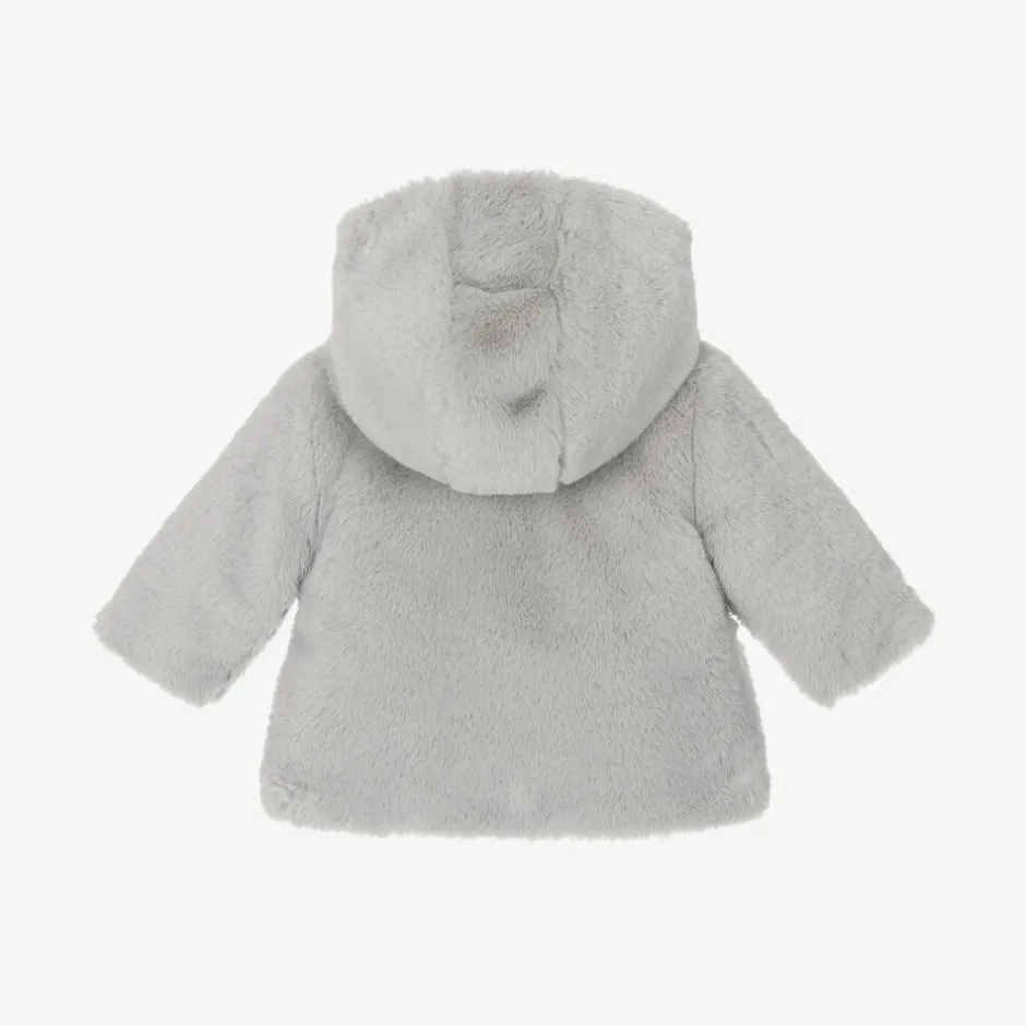 Pretty ivory and grey reversible coat for baby girls by Patachou. One side is made in quilted cotton needlecord and the other side is beautifully soft plush. It fastens with poppers on the front, helping to keep cold chills out. The plush grey side has tiny front pockets, one with a pearlescent logo charm.