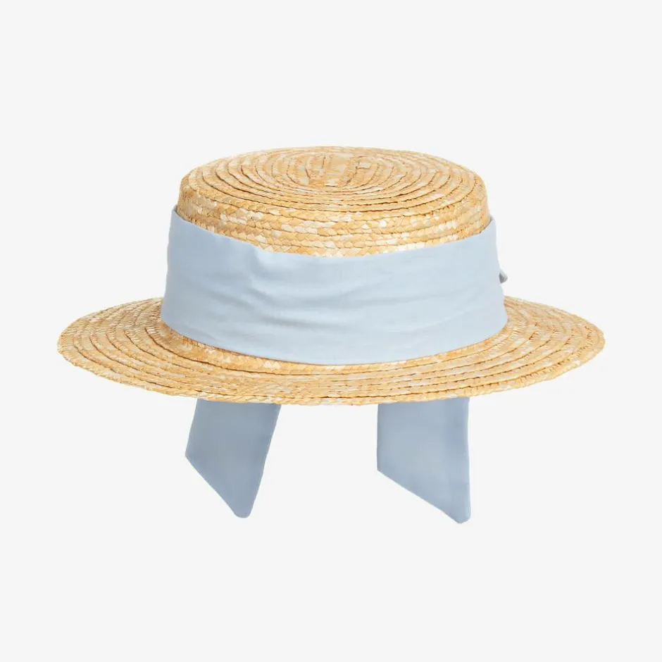 Exclusive to Childrensalon, a beige boater-style straw hat for girls by Patachou. Ideal for stylish resort wear, this timeless design has a wide brim, with a blue chiffon band and large bow on the back.
