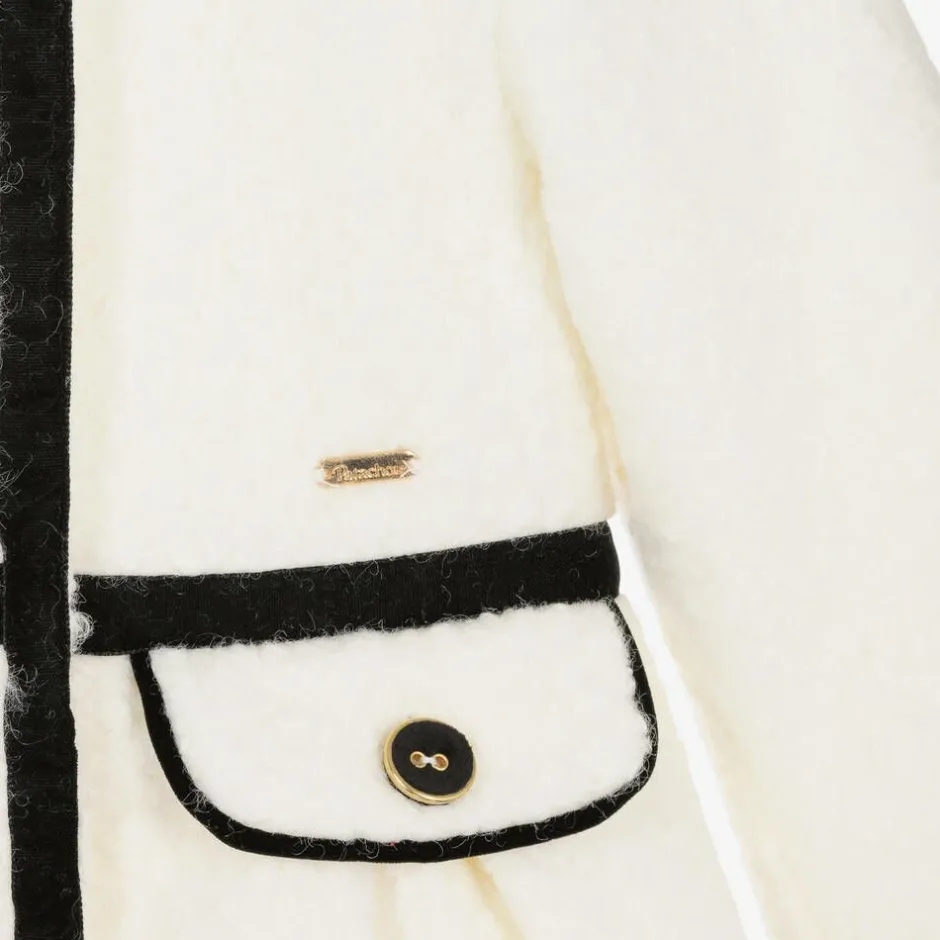 A super chic ivory coat for girls by Patachou, exclusive to Childrensalon. It is made in soft bouclé with a silky smooth lining for comfort and concealed side seam pockets. This classic and elegant style has smart black velvet trims, a rounded collar, subtle inverted pleats, and faux pocket details on the front. Fastening with black and gold buttons, it is stitched with a shiny gold logo-engraved charm for a branded finish.