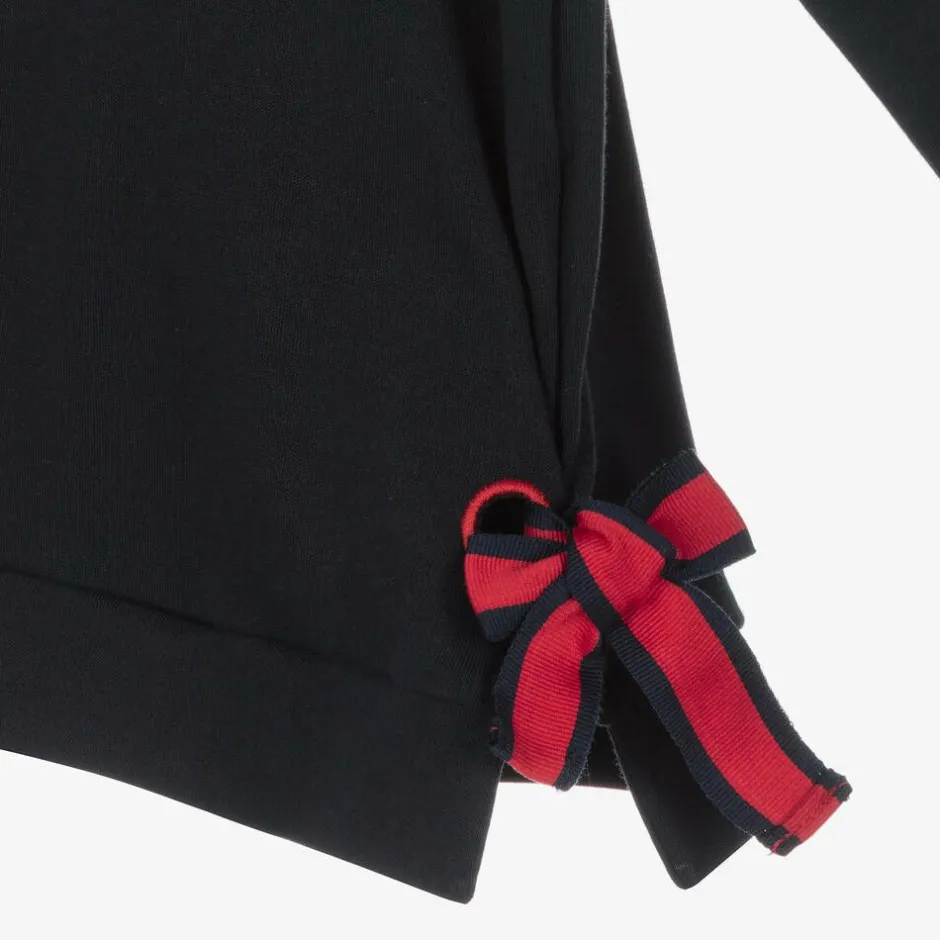 Exclusive to Childrensalon, this navy blue tracksuit for girls is by Patachou. Both pieces are made in soft, stretchy and lightweight cotton jersey, comfortable for laid-back days. Fastening with back poppers, the sweatshirt has a cute teddy bear embroidered intricately on the front, a red tartan collar, and split sides with tie-up bows threaded through eyelets. The cuffed joggers have an elasticated waist and tartan piping for colour coordination.