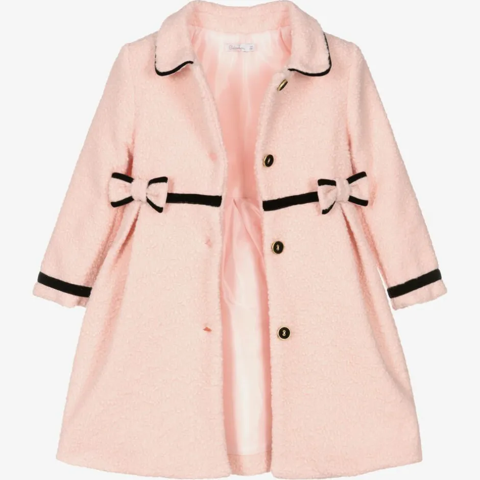 A pale pink coat for girls from Portuguese brand Patachou. With smart vintage styling, this soft bouclé coat is designed with black velvet trims, a rounded collar, and gold-tone metal button fastenings on the front. Gathered and pleated for shape, it has sweet decorative bows stitched on the front and useful side pockets. It is lined with pink satin to complete the look.