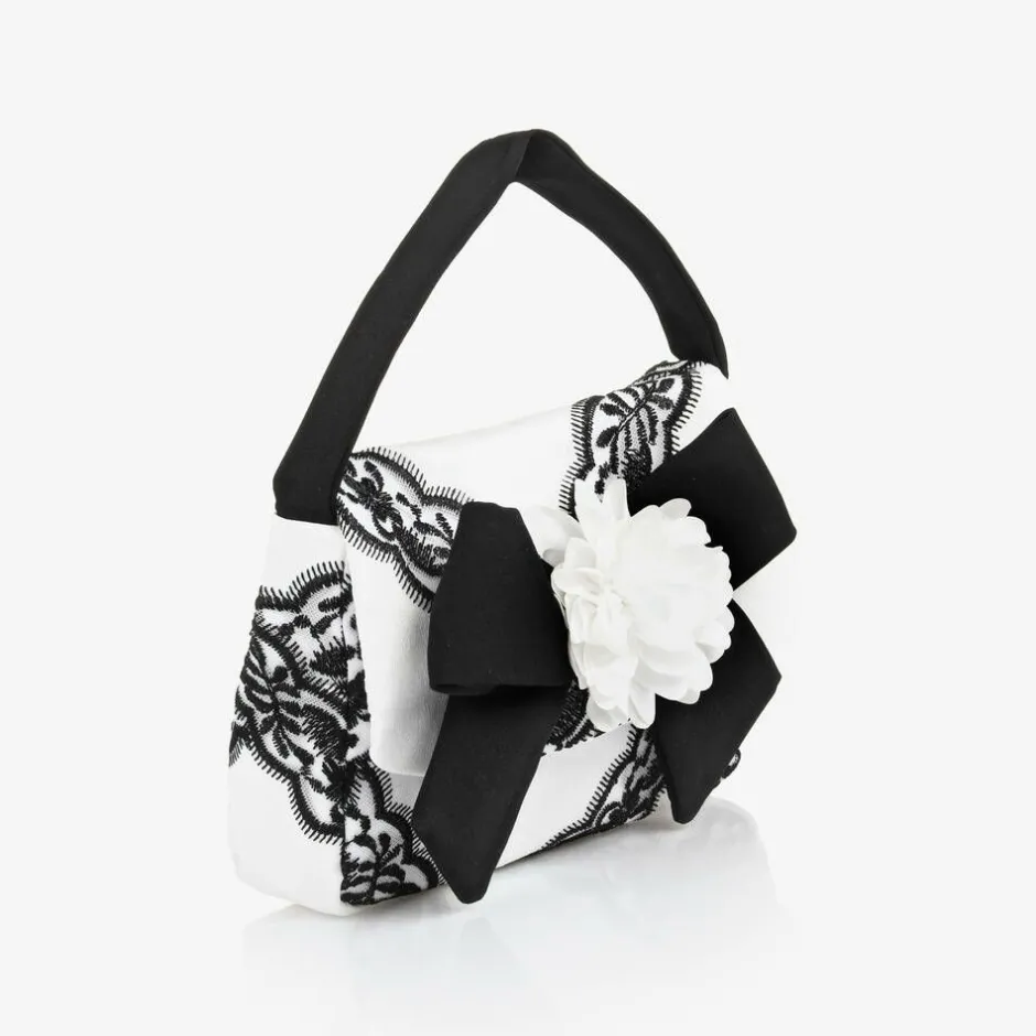 Exclusive to Childrensalon, this stylish white satin handbag for girls by Patachou, is elegantly patterned with black lace. A lovely accessory for a special outfit, the single compartment is lined in soft cotton. It secures with a popper and is trimmed on the front with a black chiffon bow and beautiful white flower appliqué.