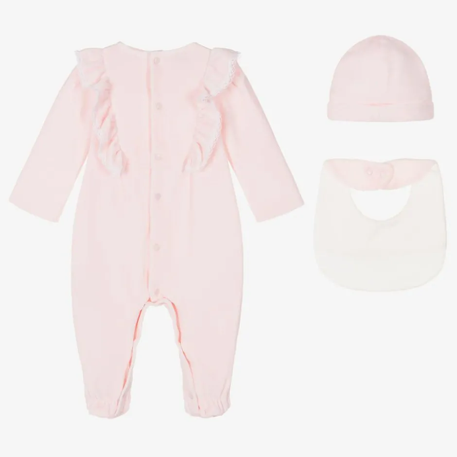 In beautifully soft velour fabric, this light pink babysuit set for girls is from Spanish brand Paz Rodríguez. The footed babygrow has lovely ruffles on the bodice with a delicate white lace trim. There is a mother-of-pearl logo charm on the front with a dainty velvet bow. Poppers fasten on the back and between the legs. Helping to protect clothing from dribble and spills, the matching bib has a contrast ribbed panel and adjustable popper fastenings. A jersey-lined hat, styled with a folded brim, completes this classic three-piece set.