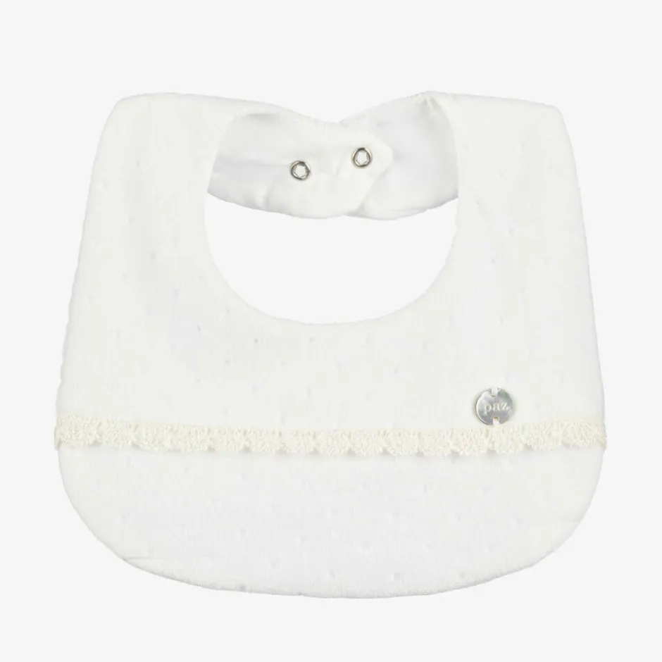 Ivory babysuit set for boys and girls by Paz Rodríguez, made in soft cotton velour. For a classic look, the babygrow has a Peter Pan collar and a pin-tucked panel on the front, detailed with delicate lace and decorative buttons. It fastens on the back and between the legs with poppers. Lined in soft jersey, the cosy hat has a cute turn-up brim. A matching bib, lined with lightweight voile completes the sweet set. For designer appeal, each piece features the Spanish brand's mother-of-pearl logo charm.
