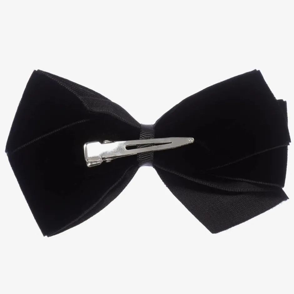 Girls classic black velvet bow hair clip by Peach Ribbons, set on a metal clip.