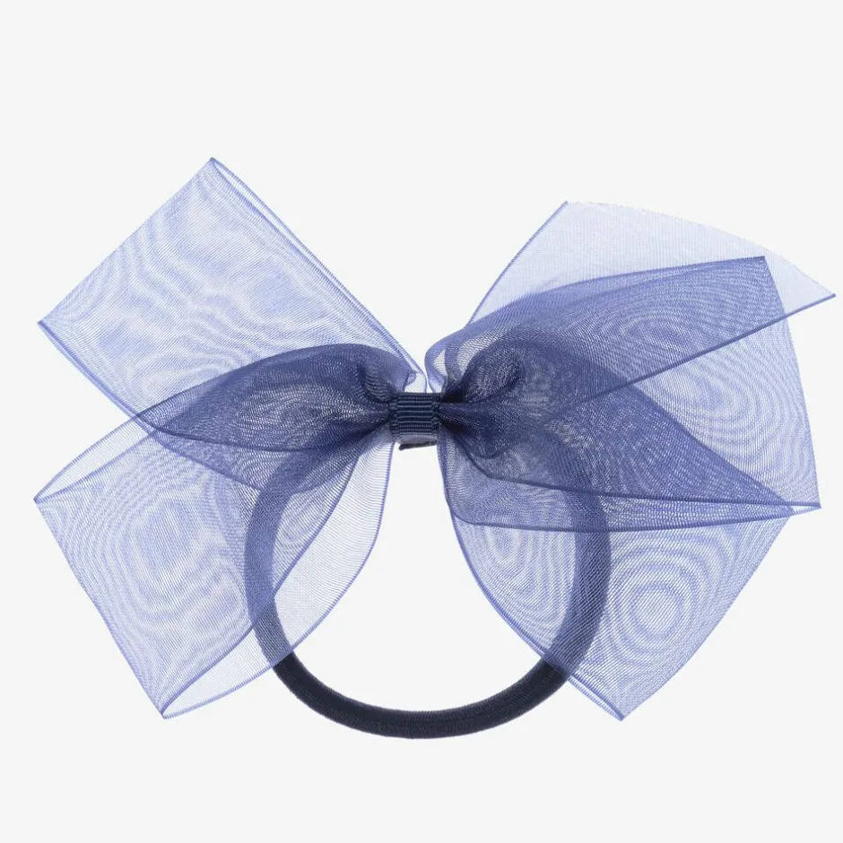 Girls pretty navy blue hair elastic by Peach Ribbons. Decorated with a handmade organza ribbon bow, this lovely accessory would complete any outfit.