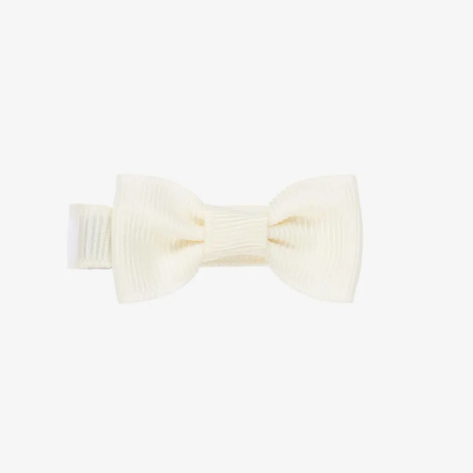 Girls ivory handmade bow hair clip by Peach Ribbons. A finishing touch to an outfit, this sweet accessory is made in grosgrain ribbon and set on a metal clip.