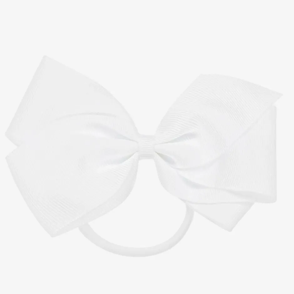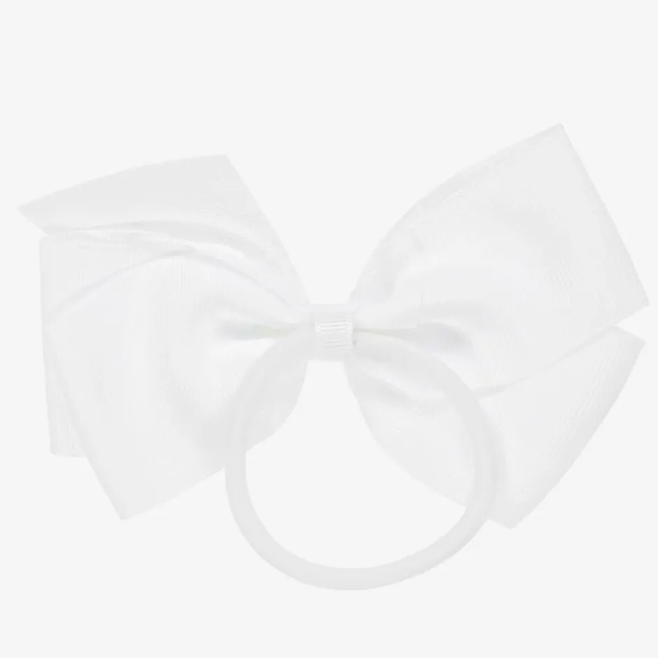 White hair elastic for girls from Peach Ribbons. Lovely to complete an outfit, this pretty accessory has a large handmade grosgrain ribbon bow detail.