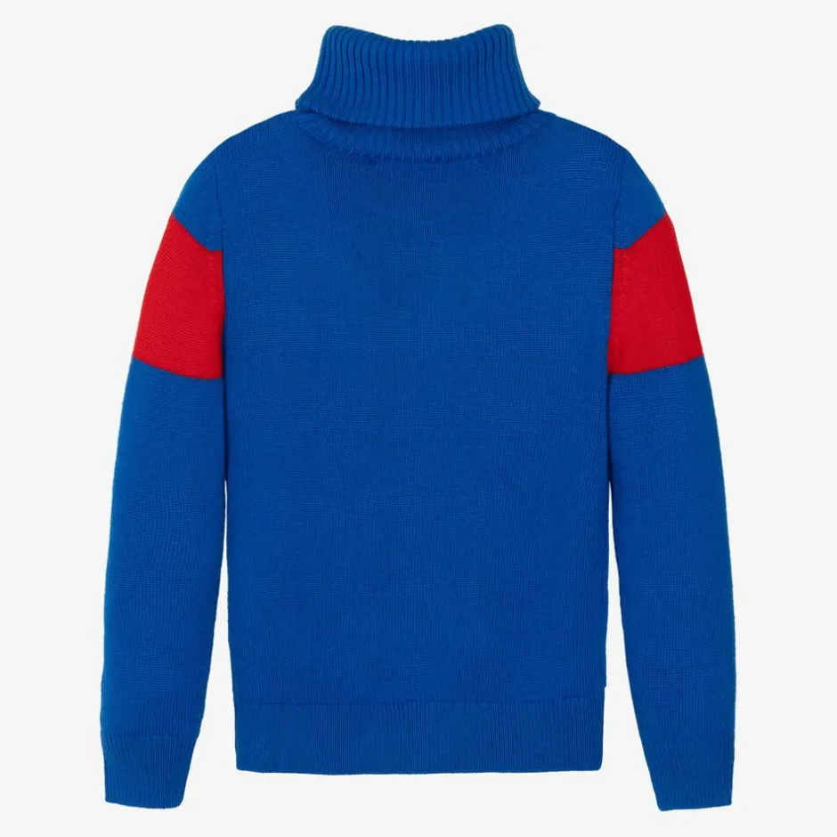 Blue roll neck sweater for boys and girls by Perfect Moment, with an aprés-ski-inspired style. Knitted in soft, extra fine Merino wool, it has an intarsia 'Ski' panel across the front and colourblock stripes on the sleeves. The brand's signature red star is embroidered above the cuff for a designer finishing touch.