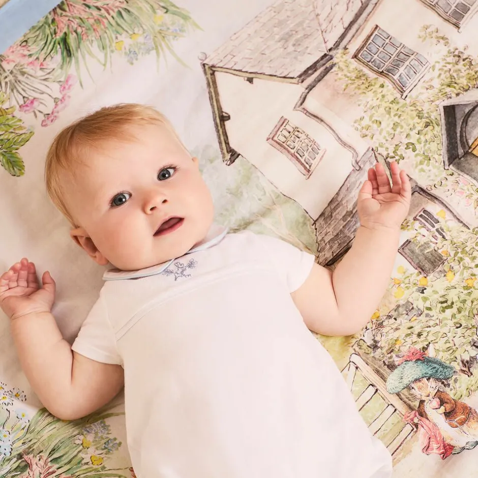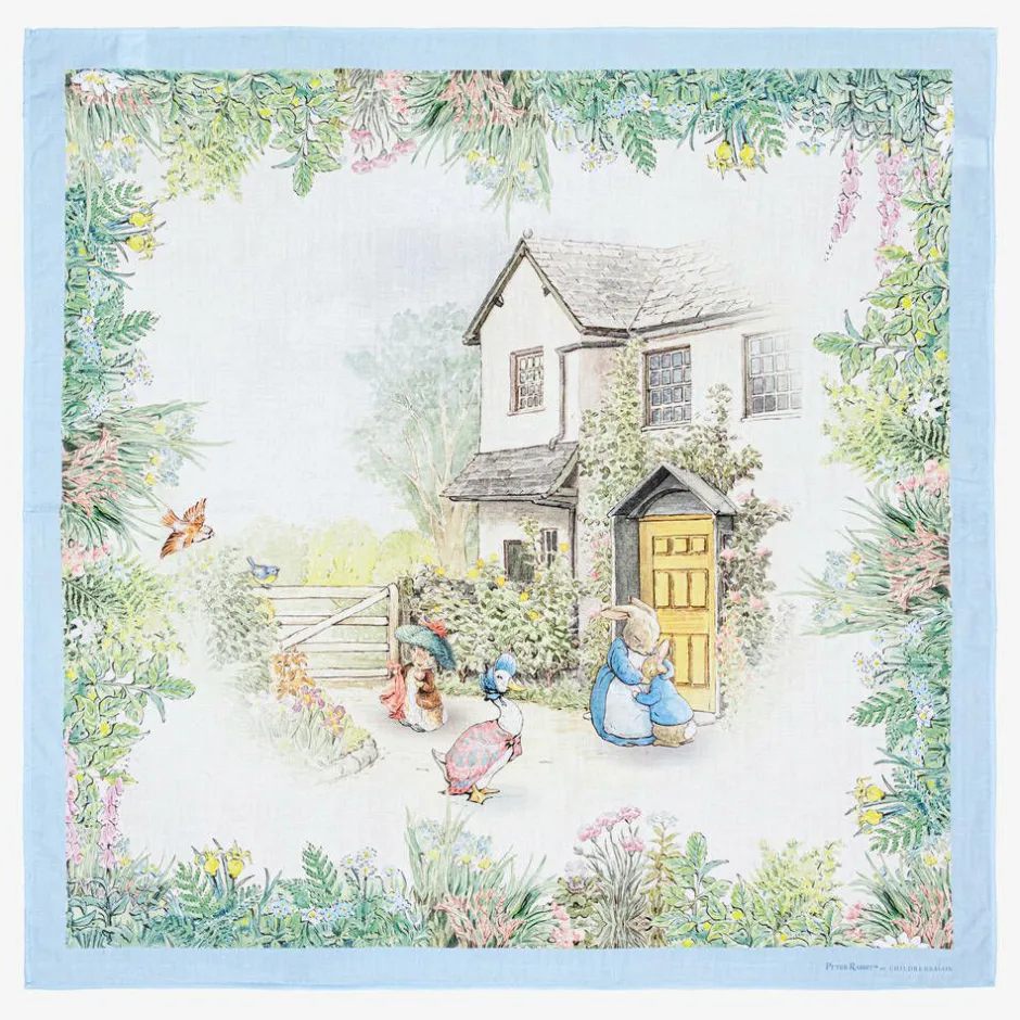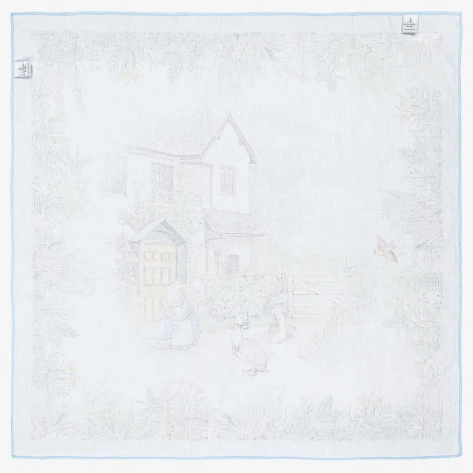 Beautiful ivory and pale blue cotton swaddle for baby boys and girls from Peter Rabbit™ by Childrensalon, printed with a charming original illustration by Beatrix Potter and a floral border. Made in soft cotton, it is breathable and lightweight, ideal for swaddling. A versatile accessory, it can also be used as a nursing cover or when out and about in the pram or car seat.