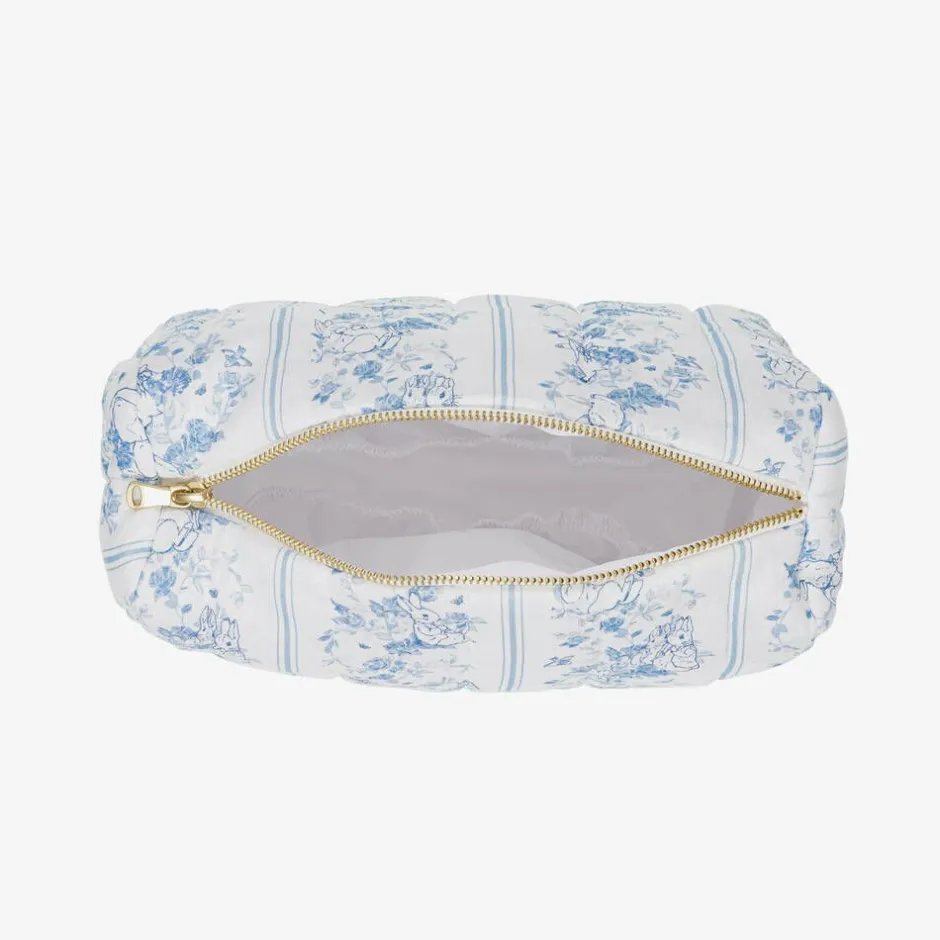 Adorable white hooded towel and wash bag set for baby boys and girls from Peter Rabbit™ by Childrensalon. Made in soft cotton towelling, the towel has linen and cotton blend trims, striped with original illustrations by Beatrix Potter in pale blue. Ideal for keeping little one warm and dry after bath time, the hood is lined in absorbent towelling. The coordinating, padded wash bag has a wipe-clean lining fitted with two useful, elasticated slip pockets on each side. It fastens with a gold zip on the top.