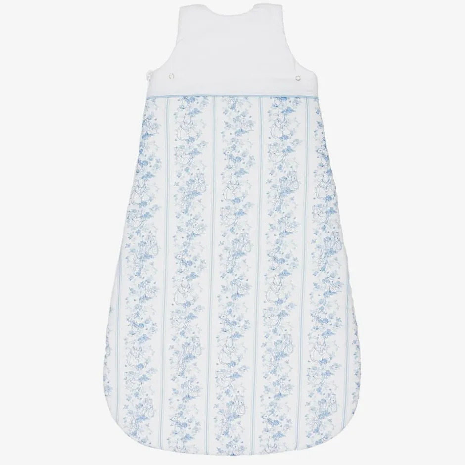 Beautiful white linen and cotton blend sleeping bag for baby boys and girls from Peter Rabbit™ by Childrensalon. It has beautiful, pale blue embroidery of original illustrations by Beatrix Potter at the top, with coordinating stripes printed below. With a Tog value of 2.5, it is lightly padded, and fastens with poppers on the shoulders and a zip that runs down one side and along the bottom. The zip has a protective guard at the top, and there are useful poppers under the arms to allow for growth.The sleeping bag is lined in soft jersey for comfort.