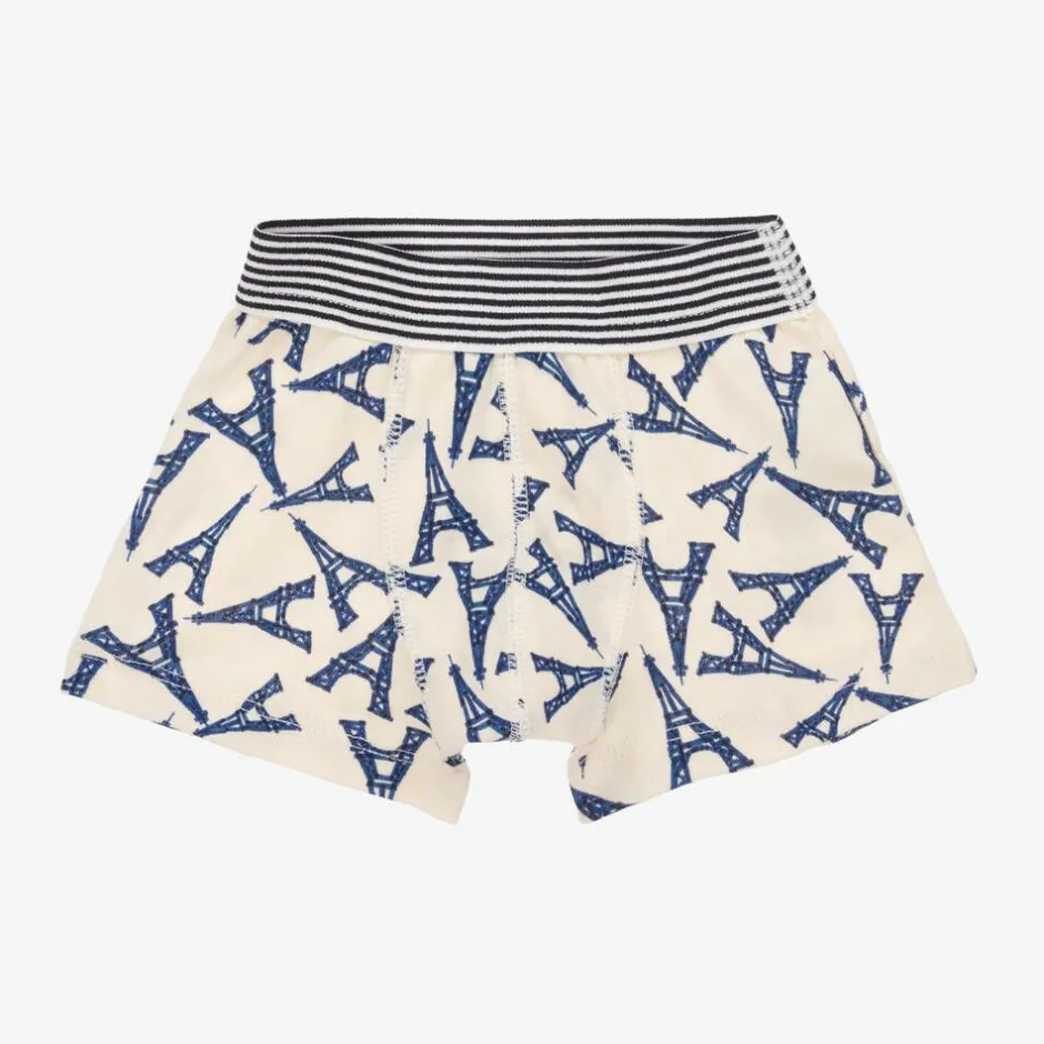 A three-pack of ivory and blue boxers for boys by Petit Bateau, made in soft organic cotton jersey. With striped, elasticated waistbands, one pair are plain, the second are striped, and the third feature Eiffel Tower prints to celebrate the designer's heritage.