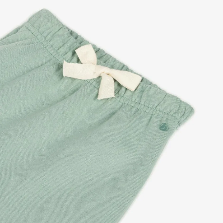 Green organic cotton trousers for little boys and girls by Petit Bateau, made in soft and comfortable jersey. They have a gently elasticated waistband with a faux tie detail and cute turn-up cuffs. A small tonal logo print on the hip adds a subtle branded finish.