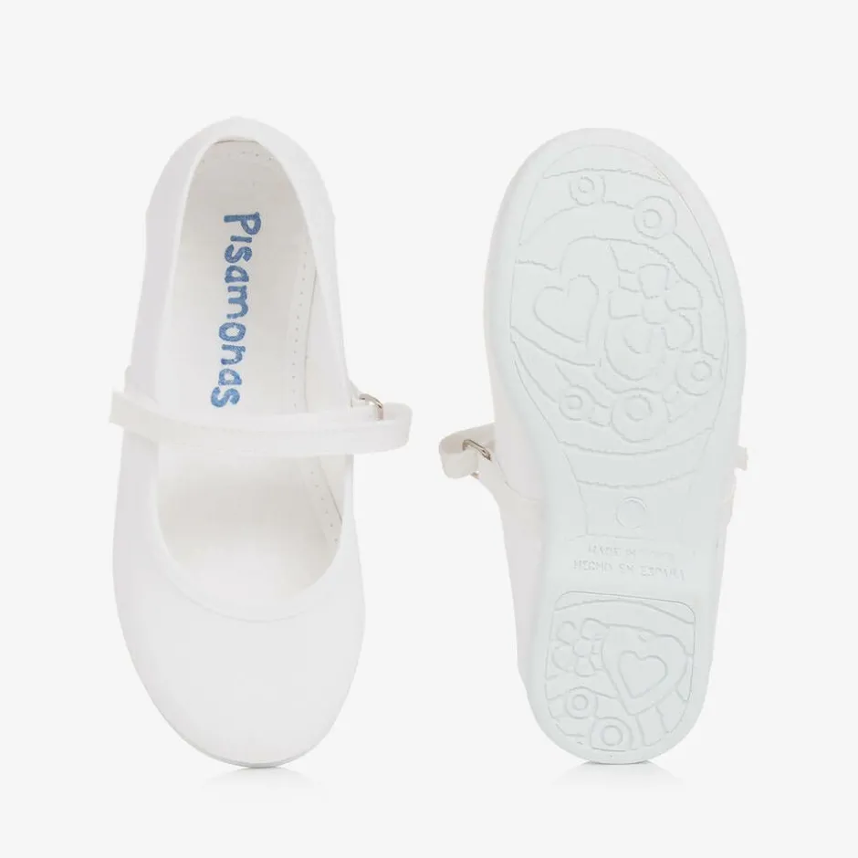 White bar shoes for girls by Spanish brand Pisamonas. Made in soft canvas, they fasten simply with a velcro strap across the foot. These pretty, casual shoes have a non-slip rubber sole in the same colour as the shoe making them even easier to combine with all outfits.