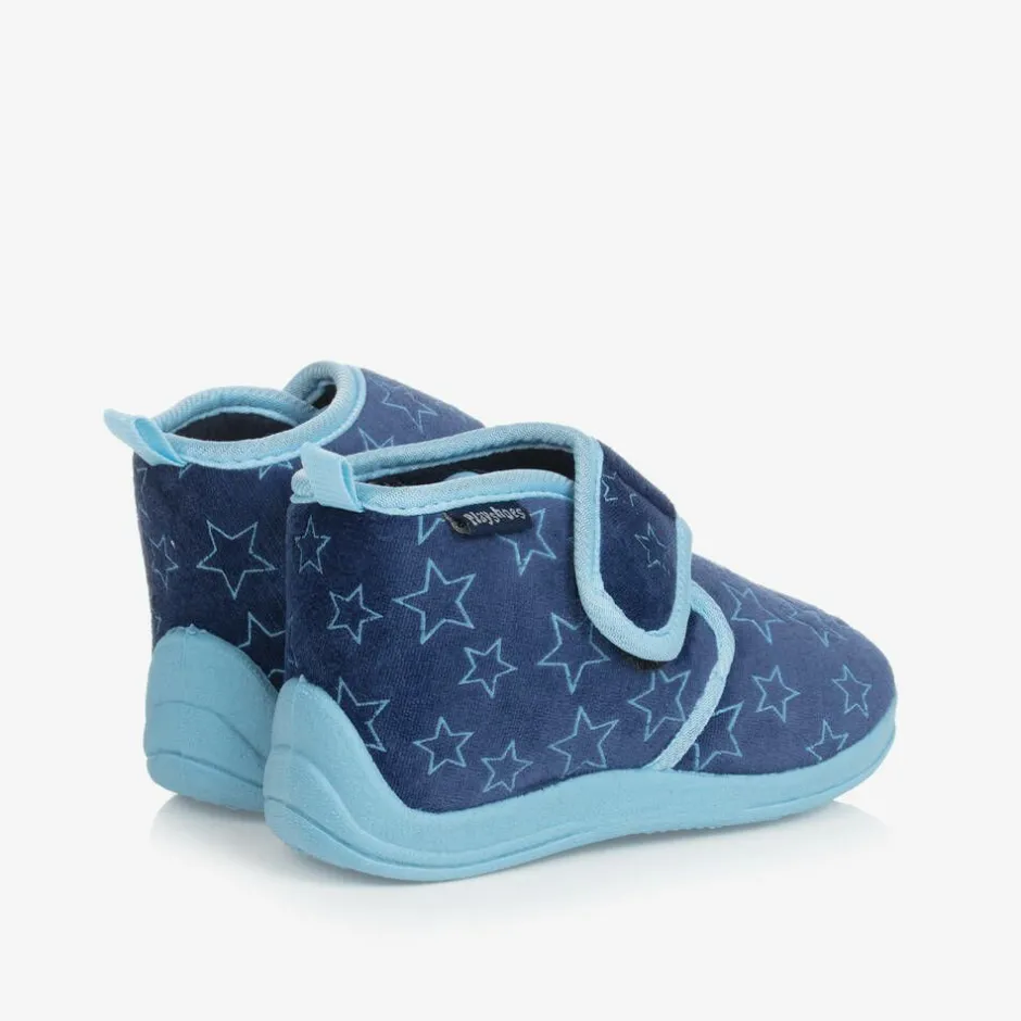 Little boys and girls navy blue slippers by Playshoes, with a fun light blue stars pattern. They have soft velour fabric uppers, a soft fabric lining and flexible, non-slip rubber soles. Easy to fasten, they have velcro straps to ensure they stay securely on little feet.