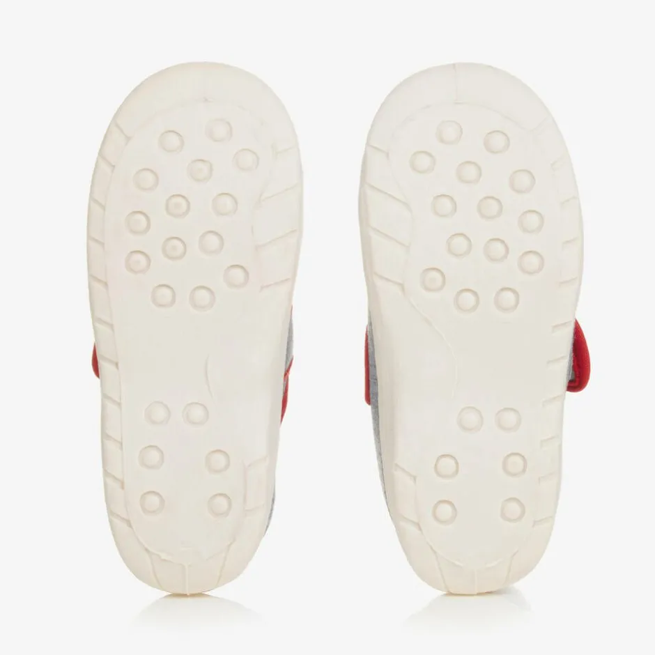 Grey marl jersey slippers for boys by Playshoes. They have bright red trim and grey logo embroidery on the heel, and fun race car embroidery on the toe. They have a soft jersey lining and non-slip rubber soles. They fasten with a velcro strap embroidered with a checkered flag.
