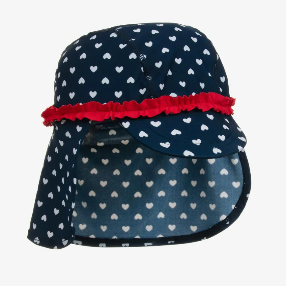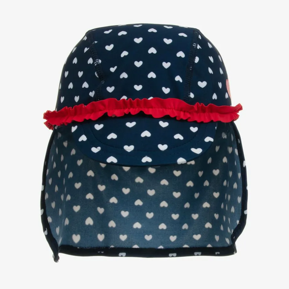 Girls navy blue Legionnaire-style swim hat by Playshoes, with UPF 50+ protection against the sun's harmful rays. Made in stretchy lycra with a white and red heart-print pattern and a pretty red trim, it is ideal for wearing in the pool. This sweet hat covers the ears and the back of the neck and has a peaked front to protect the eyes.
