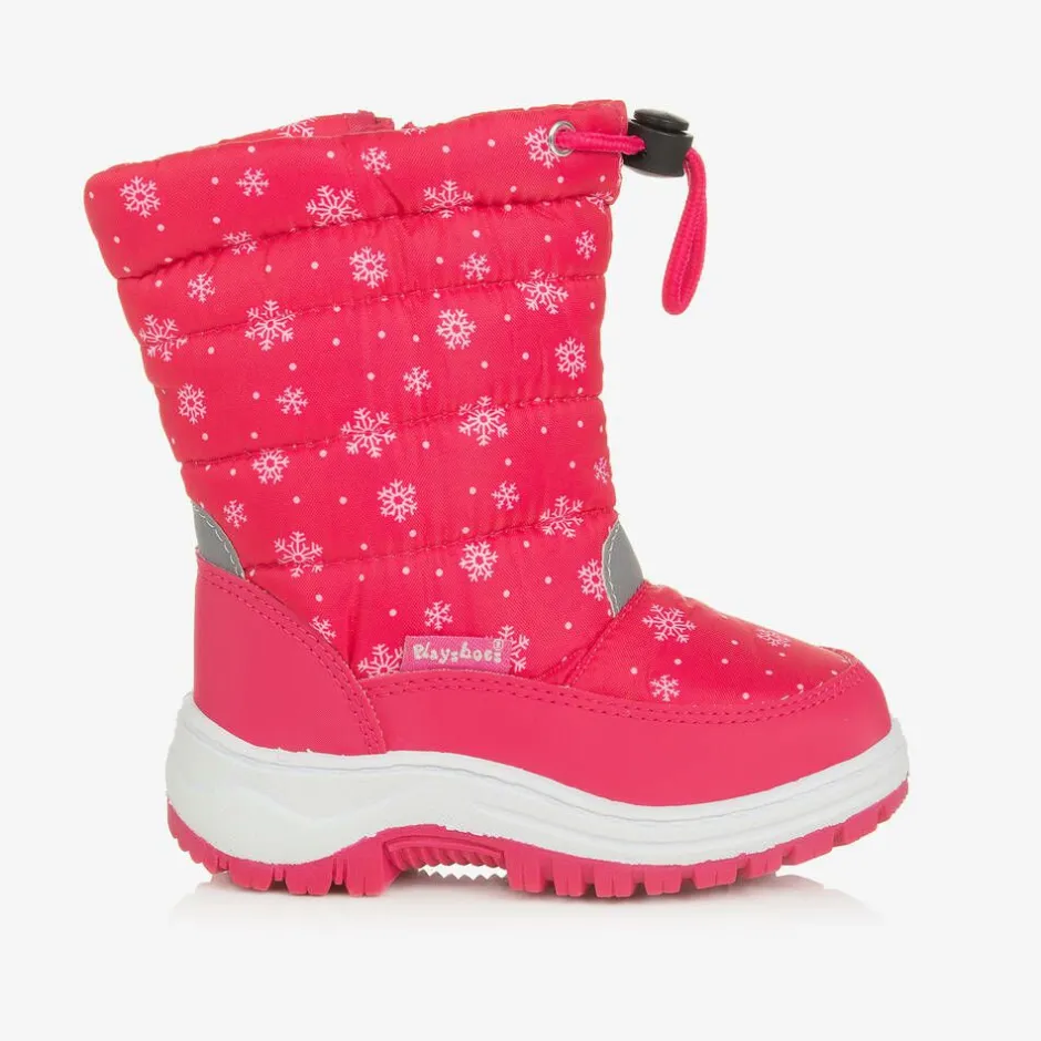 Designed by Playshoes, a bright pink pair of snow boots for girls, with a sweet white snowflake pattern. Soft and cosy, they have water repellent fabric uppers, a fleecy lining and deep tread rubber soles. There are light reflective trims on the front, drawstring cuffs and useful side zips.