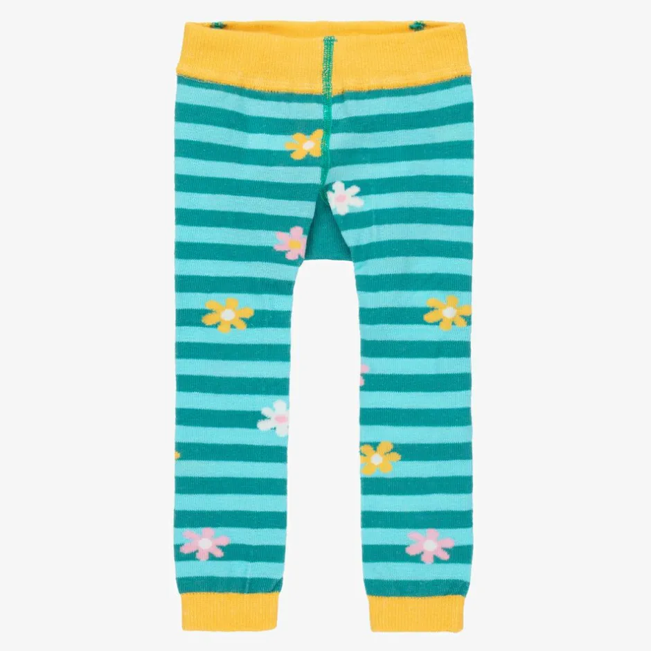 Little girls blue leggings by Powell Craft, made in a soft cotton knit. They have a striped pattern with flowers and a bumblebee motif. They are soft and stretchy, and can also be worn as footless tights.