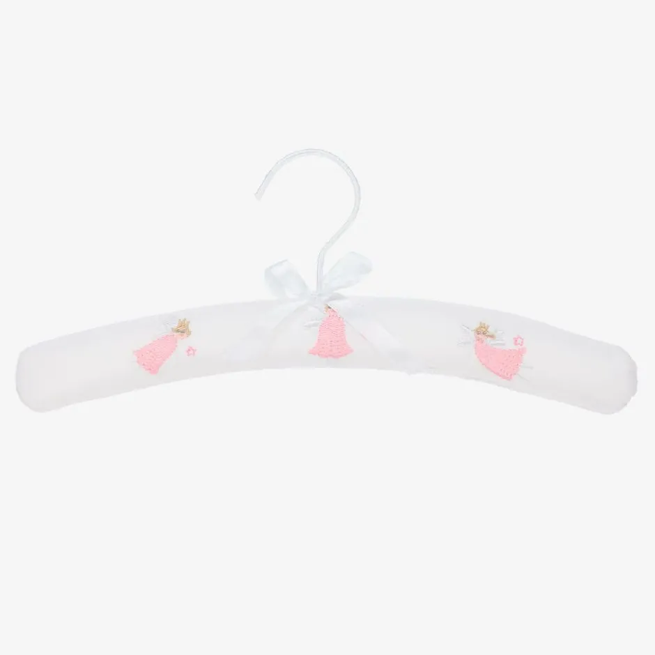 Traditional padded coat hanger from Powell Craft, in white cotton with three embroidered angels on the front. The hook is covered in white satin ribbon with a pretty bow detail.