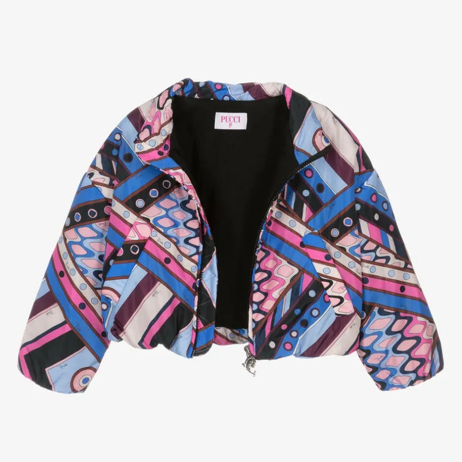 A blue puffer jacket for girls by luxury label PUCCI, with lightweight padding for warmth. Bold and striking, the silky fabric features the designer's archival Vivara print with black and pink detailing. Lined with comfortable cotton jersey, it has an inner drawcord on the hem to adjust the width, elasticated cuffs for cosiness, and a silver-coloured front zip in the shape of the brand's famous overlapping fish motif. This boxy-fit jacket has useful side pockets.