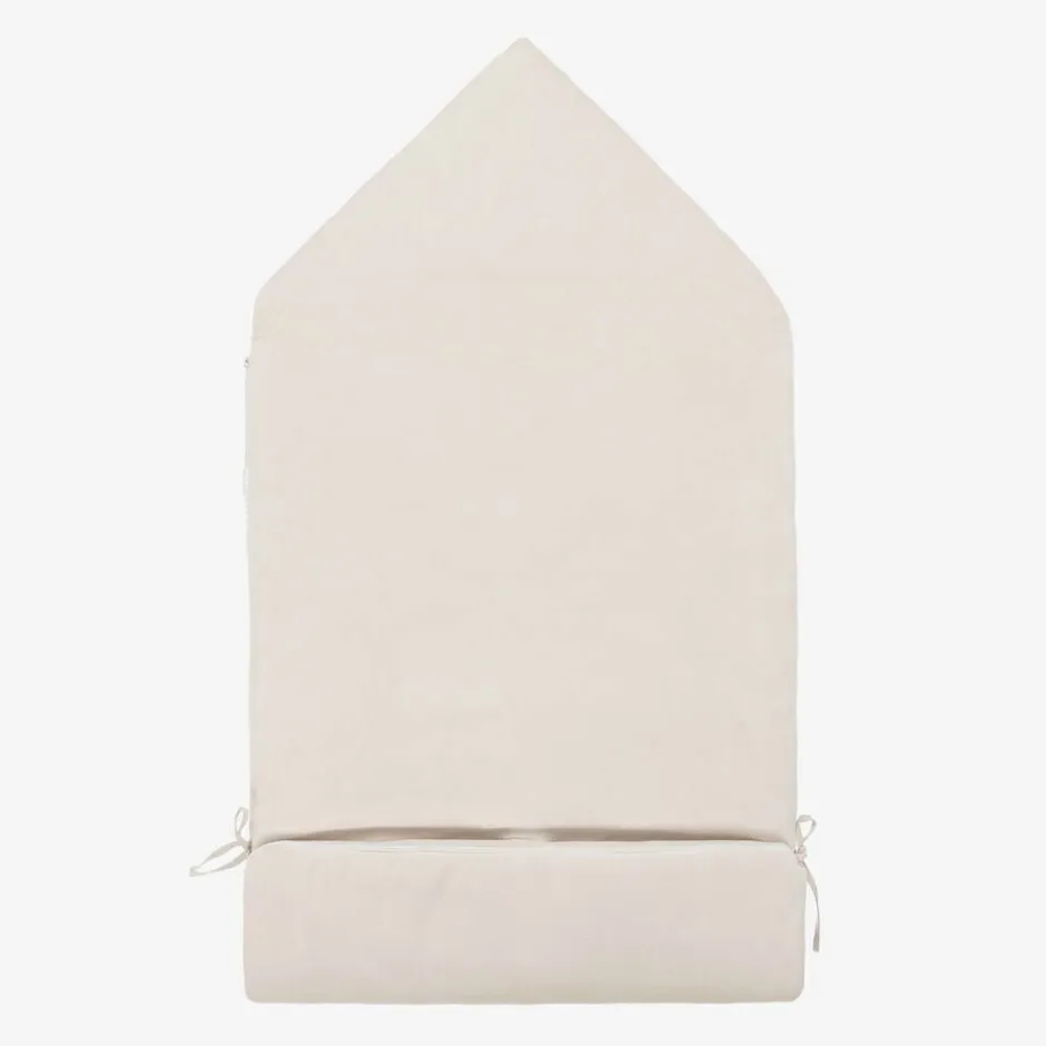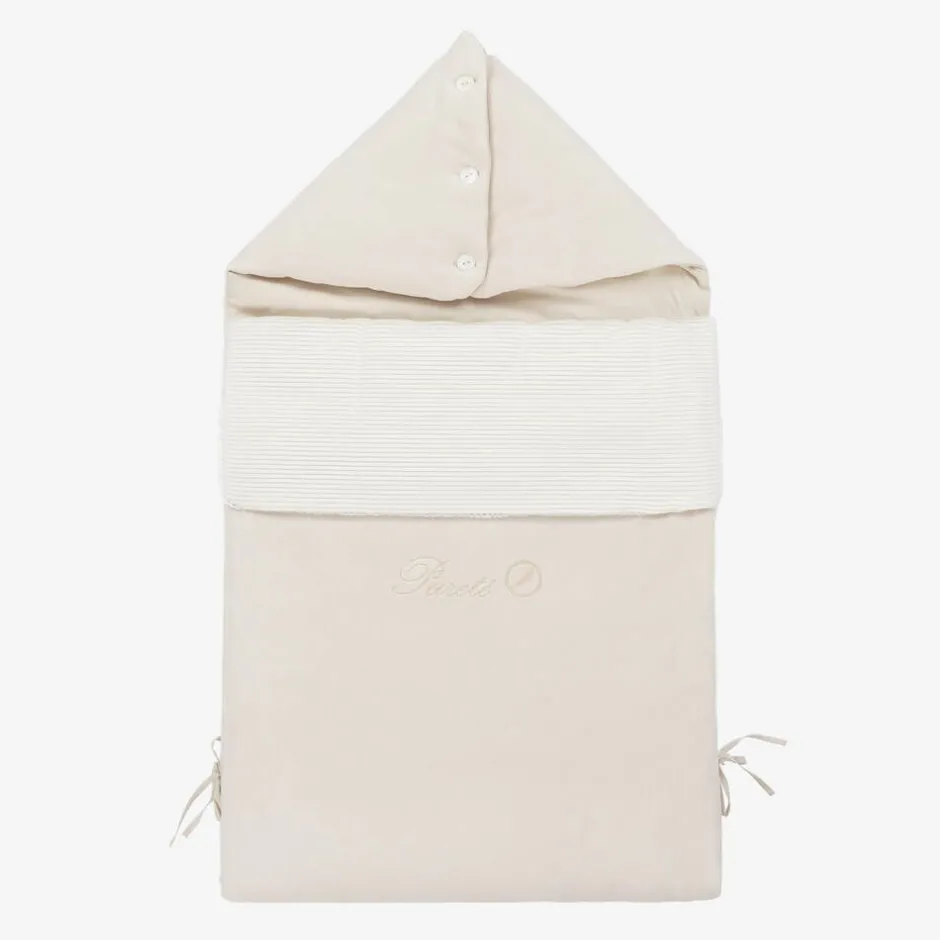 Exclusive to Childrensalon, a lovely beige nest for baby boys and girls by Pureté Du… Bébé, with ties on each side to adjust the length as your little one grows. Lightly padded, this cosy nest is made in super soft velour with a cotton jersey lining. It has a finely pleated woven panel on the front, with a delicate scalloped lace trim and tonal logo embroidery for designer appeal. Fastening with a zip along one side and across the base, it has buttons on the hood which can be unfastened to create a flat, comfortable surface for baby to lay on.