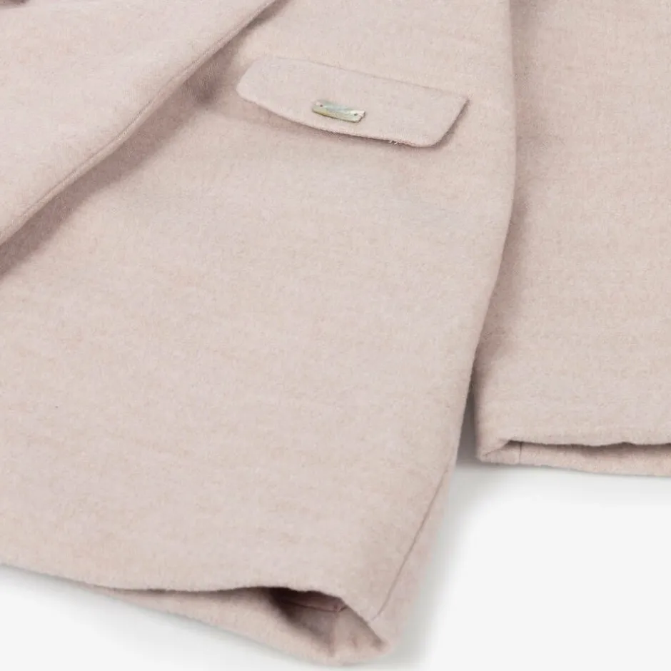 A lovely pale pink coat for younger girls by Pureté Du… Bébé, made in beautifully soft fabric with a felted feel. Lined in silky satin, this traditionally-styled coat has double-breasted button fastenings and a collared neckline. There are two decorative pockets on the front, one of which is branded with a pearlescent logo charm. For a different look, the coat comes with a detachable faux fur collar which attaches to the neckline with elasticated loops and hidden buttons.